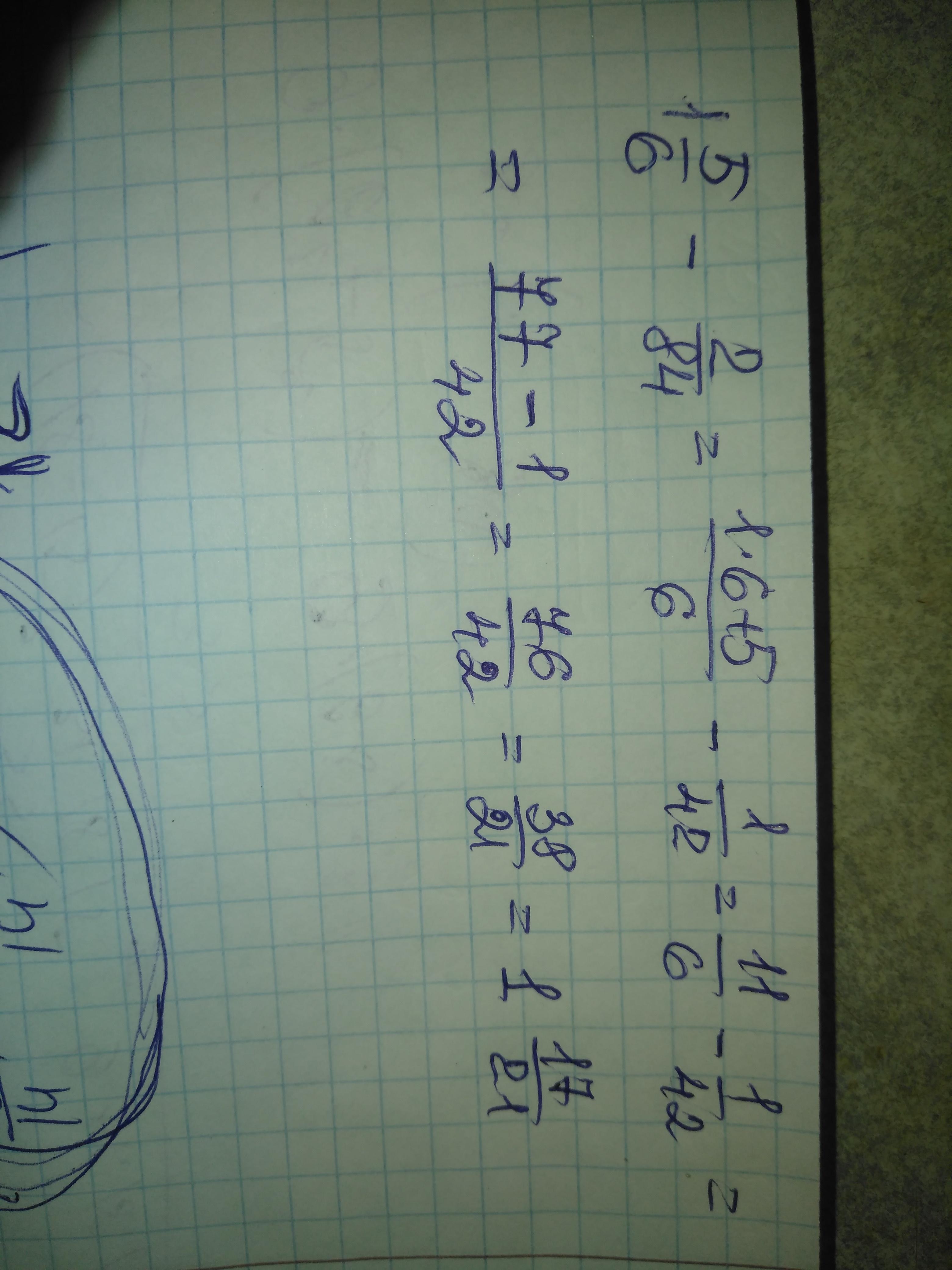 1 целая 5/6 - 2/ 84 = 11/6 - 2/84 = 11*14 /84 - 2/84 =154/84 - 2/84 = 152 /84 или 1 целая 68 /84 (можно сократить) 1 целая 17/21