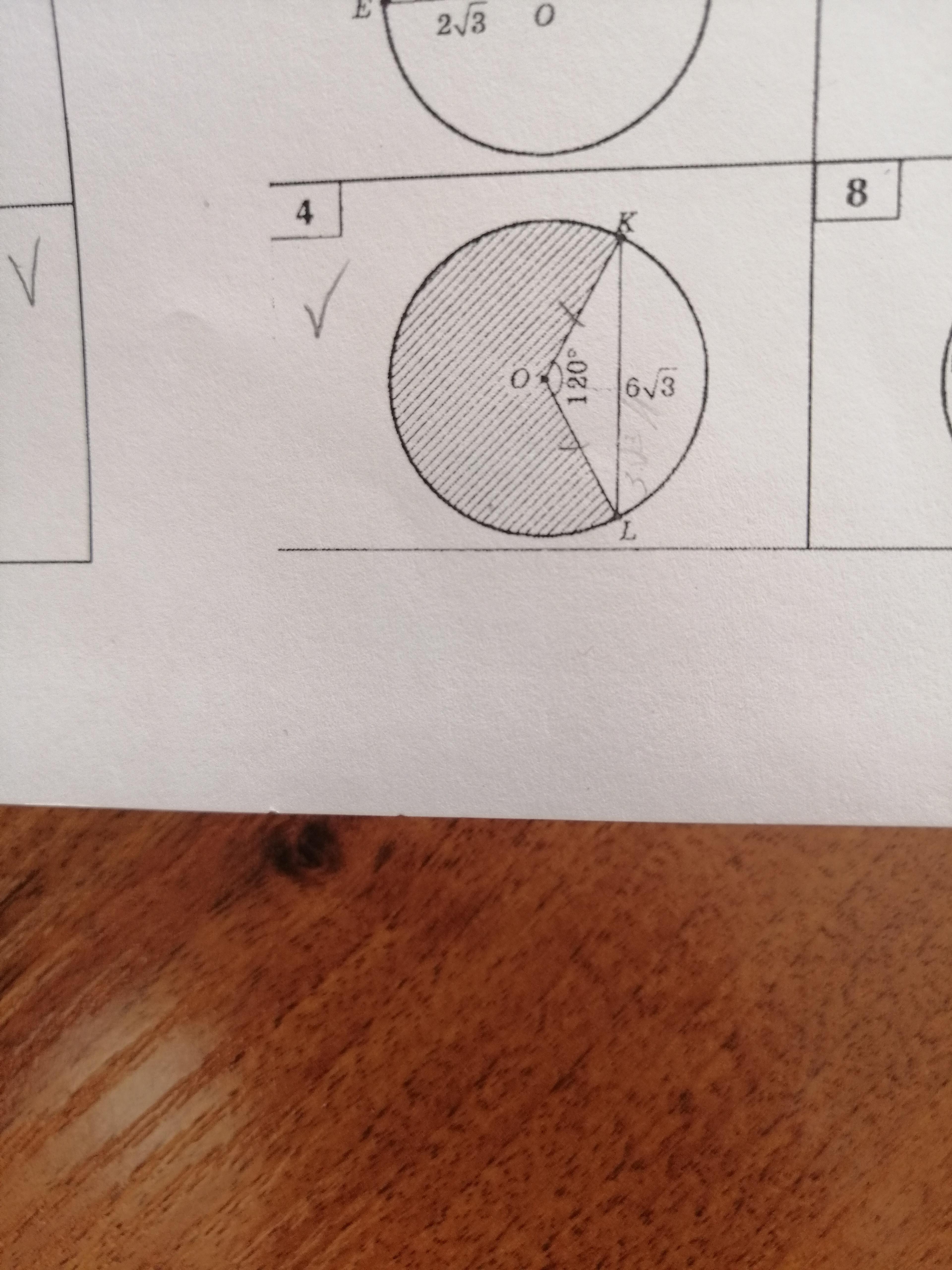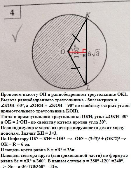 4) Дан круг. Внутри его ценрального угла KOL проведена прямая KL=6√3 так, что получается треугольник. Угол O=120°. Найти пдощадь закрашенной фигуры