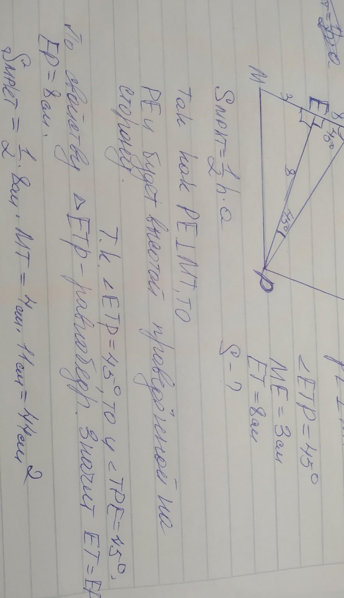 Рассмотрим треугольник PET. Oн прямоугольный (угол PET=90°) и зная что угол ETP=45° мы делаем вывод что треугольник PET-равнобедренный т.к. угол PET=90°, угол EPT=45° и угол ETP=180-(90+45)= 45° => ET=PT=8см
