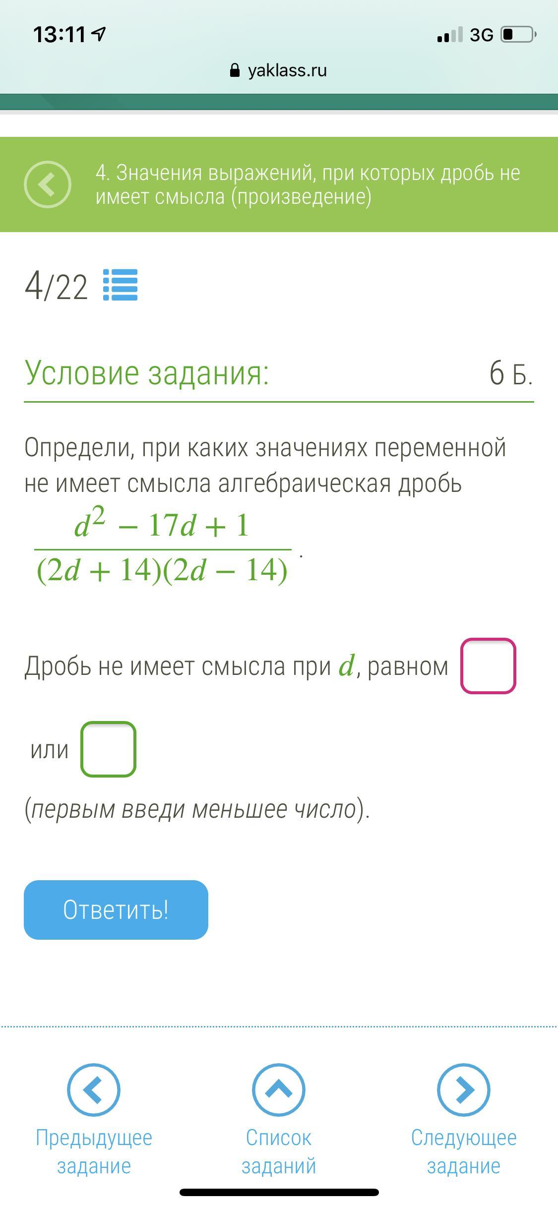 Дробь не имеет смысла при d=-7 или d=7