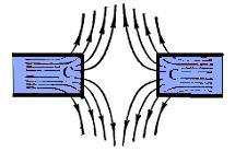 Так как одноименные полюса магнитов отталкиваются, то и линии магнитного поля расходятся