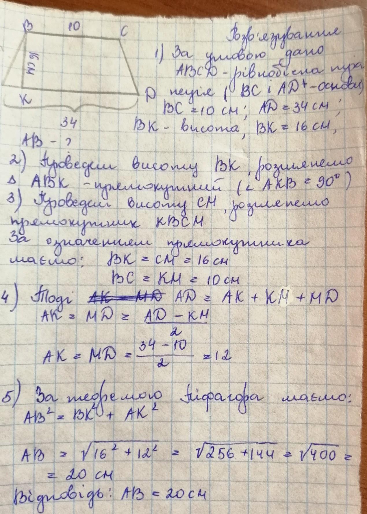 основи рівнобічної трапеції дорівнюють 10 см і 34 см а її висота 16 см знаїдить бічну сторону трапеції