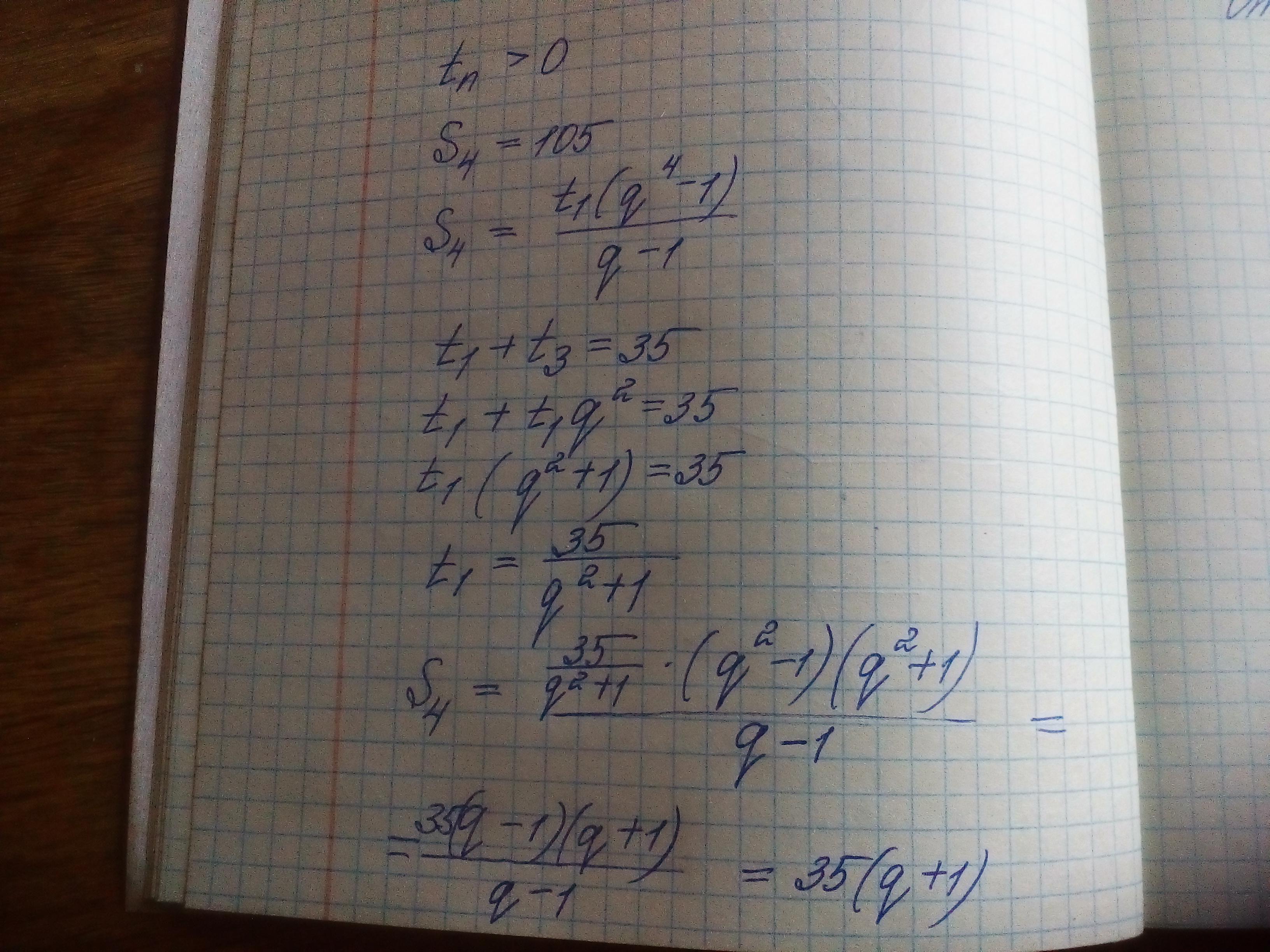 Все члены геометрической прогрессии (tn) — положительные числа. Известно, что сумма первых четырех членов прогрессии равна 105, а t1+t3=35. Найдите знаменатель прогрессии.