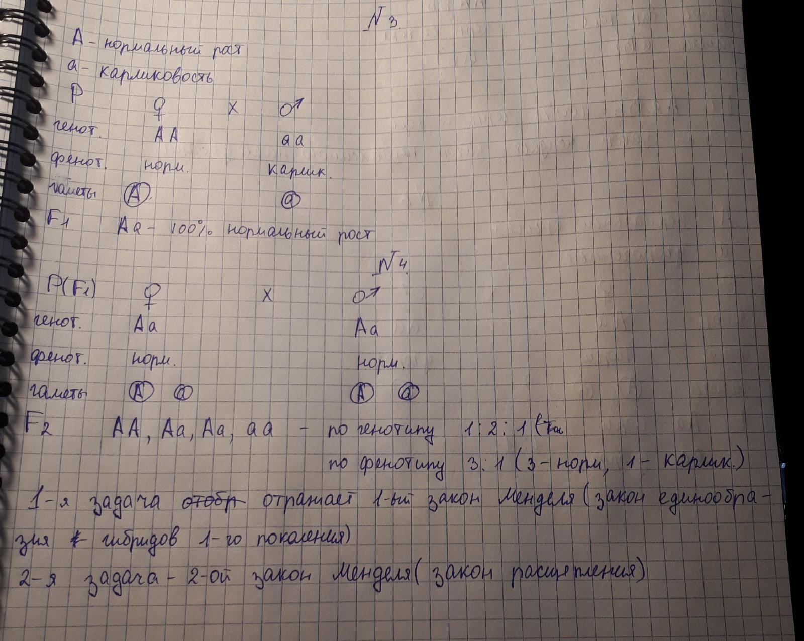 4. Продолжите. Полученные гибриды томатов первого поколения скрестили между собой. Определите генотипы гибридов второго поколения. Какой закон Менделя отражает первая задача, какой – вторая?