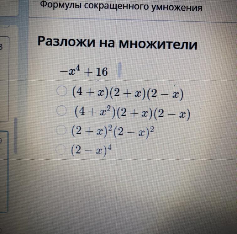 -x^{4} + 16=16-x^{4} =2^{4}-x^{4}=(2^{2}-x^{2})(2^{2}+x^{2}) =(2+x)(2-x)(4+x^{2})