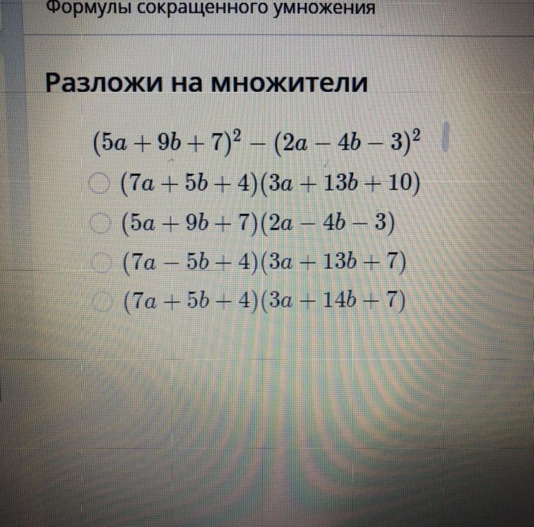 (5a+9b+7+2a-4b-3)(5a+9b+7-2a+4b+3) = (7a+5b+4)(3a+13b+10)