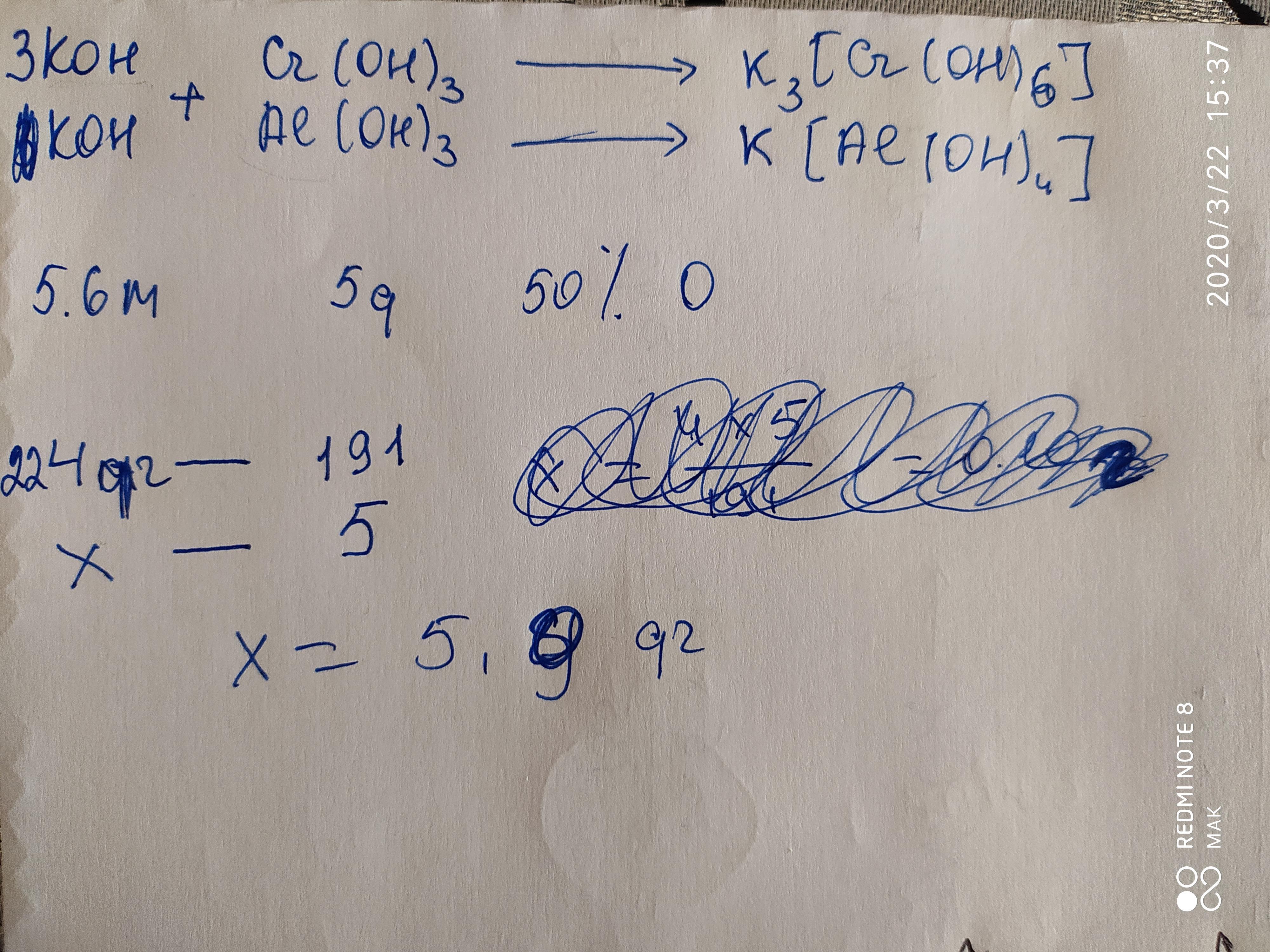 Какой объём 5,6 М раствора гидроксида калия потребуется для полного растворения 5,0 г смеси гидроксида хрома (3) и алюминия, если массовая доля кислорода в этой смеси 50%?