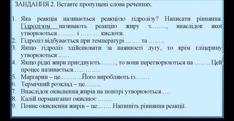 Ответ: 6. Термічний розклад- це розклад речовини при певній температурі. 7. Внаслідок окиснення жирів на повітрі утворюється неприємний запах і гіркий смак. 8. Калій перманганат окиснює органічні сполуки. 9. Повне окиснення жирів-це вивільнення енергії.