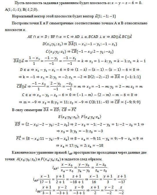Задані площина х-y-z-6=0 та дві точки А(1;-1;-1) та В(-1;2;0). Промінь світла проходить через точку А і відбившись від площини проходить через точку В. Скласти рівняння прямих, які містять падаючий та відбитий промінь.
