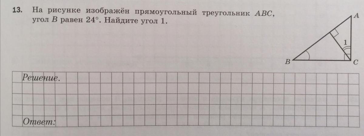 Угол А=180-90-24=66°, тогда угол 1=180-90-66=24°