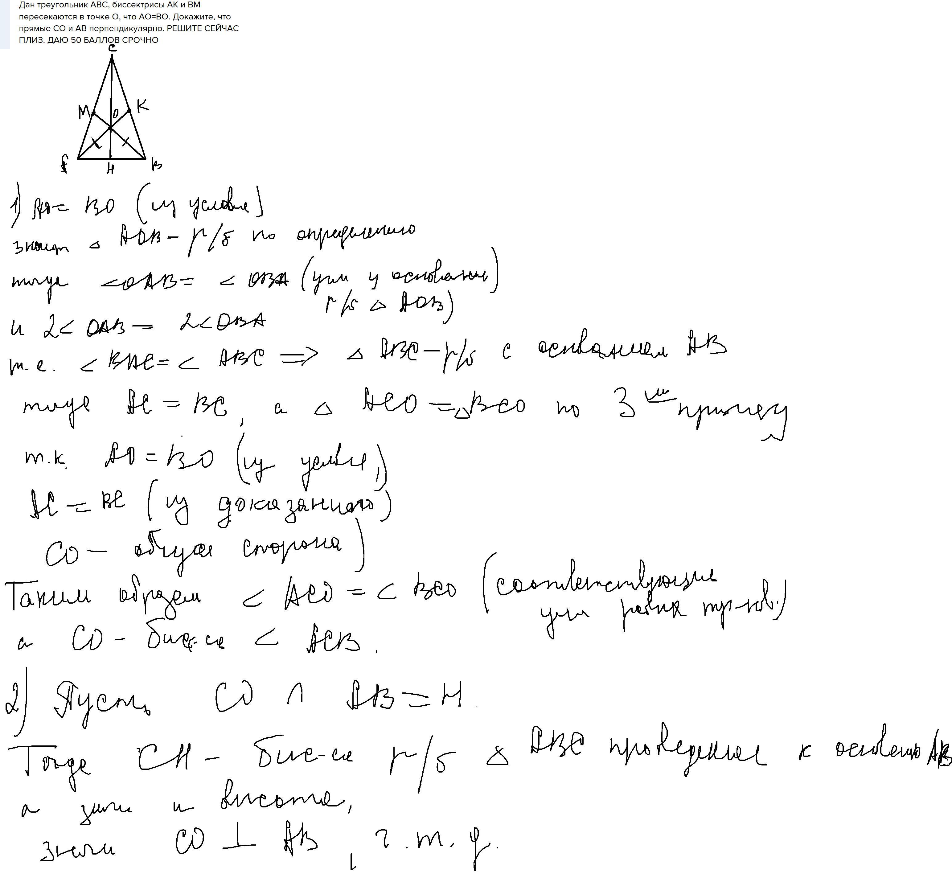 дан треугольник ABC, биссектрисы AK и BM пересекаются в точке O, что AO=BO. Докажите, что прямые CO и AB перпендикулярно. РЕШИТЕ СЕЙЧАС ПЛИЗ. ДАЮ 50 БАЛЛОВ СРОЧНО