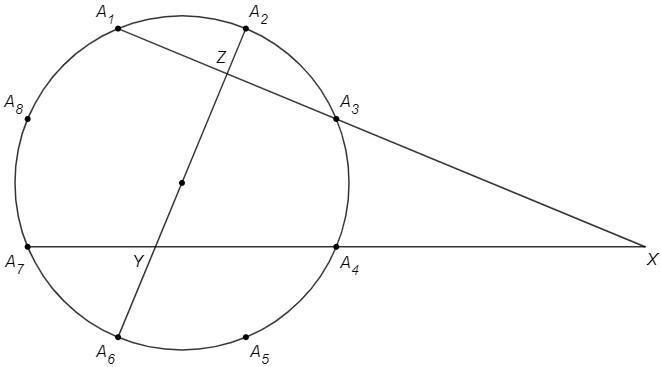 Точки А1,..,A8 делят окружность на 8 равных дуг. Пусть X — точка пересечения прямых А1А3 и А4А7, Y - точка пересечения прямых А2А6 и А4А7, Z - точка пересечения прямых А1А3 и А2А6. Найдите углы треугольника XҮZ.