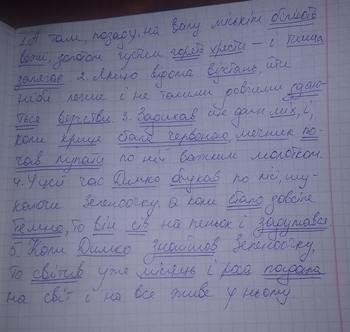 Підкресліть граматичні основи. 1. А там, позаду, на валу міськім біліють вежі, золотом густим горять хрести — і тиша залягає (М. Зеров). 2. Якщо відома відстань, йти ніби легше і не такими довгими здаються верстви (В. Шевчук). 3. Задихав ще один міх, і, коли криця стала червоною, мечник почав лупати по ній важким молотом (3. Тулуб). 4. У цей час Димко блукав по лісі, шукаючи Зеленоочку, а коли стало зовсім темно, то він сів на пеньок і задумався (В. Шевчук). 5. Коли Димко знайшов Зеленоочку, то світив уже місяць і роса падала на світ і на все живе у ньому (В. Шевчук).