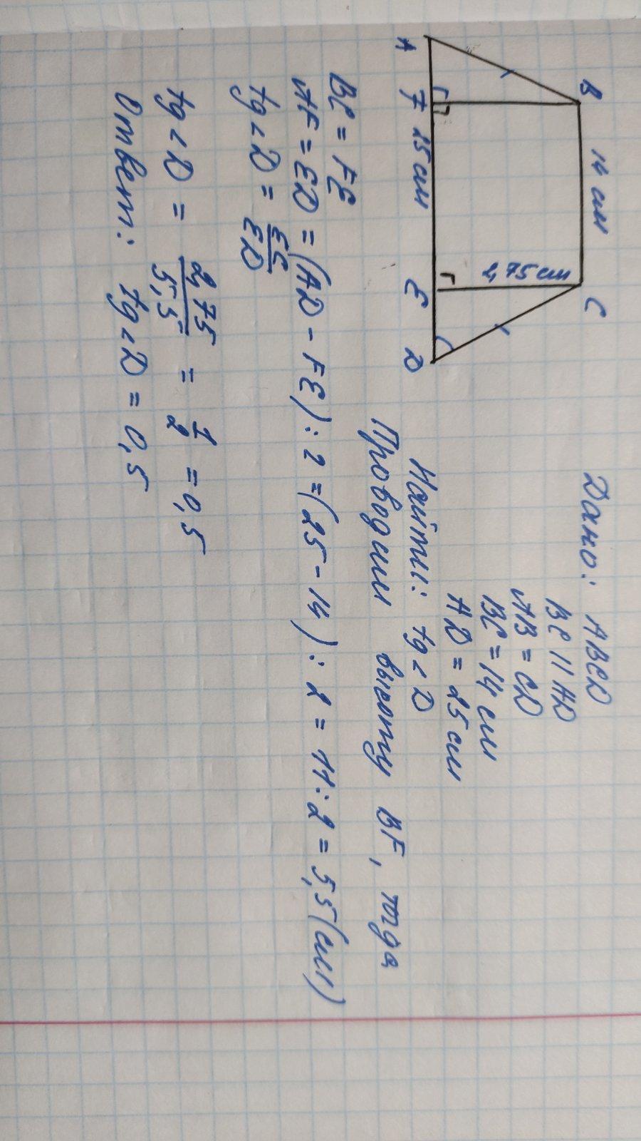 Основания равнобедренной трапеции равны 25 см и 14 см. Высота трапеции равна 2,75 см. Найдите тангенс острого угла. Ответ запишите в виде десятичной дроби.