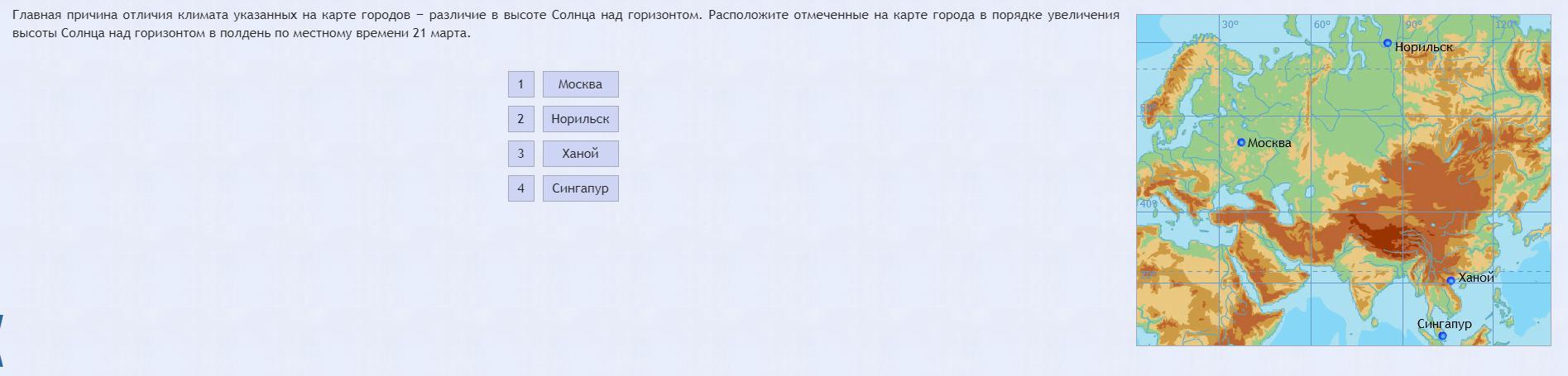 Главная причина отличия климата указанных на карте городов – различие в высоте Солнца над горизонтом. Расположите отмеченные на карте города в порядке увеличения высоты Солнца над горизонтом в полдень по местному времени 21 марта.