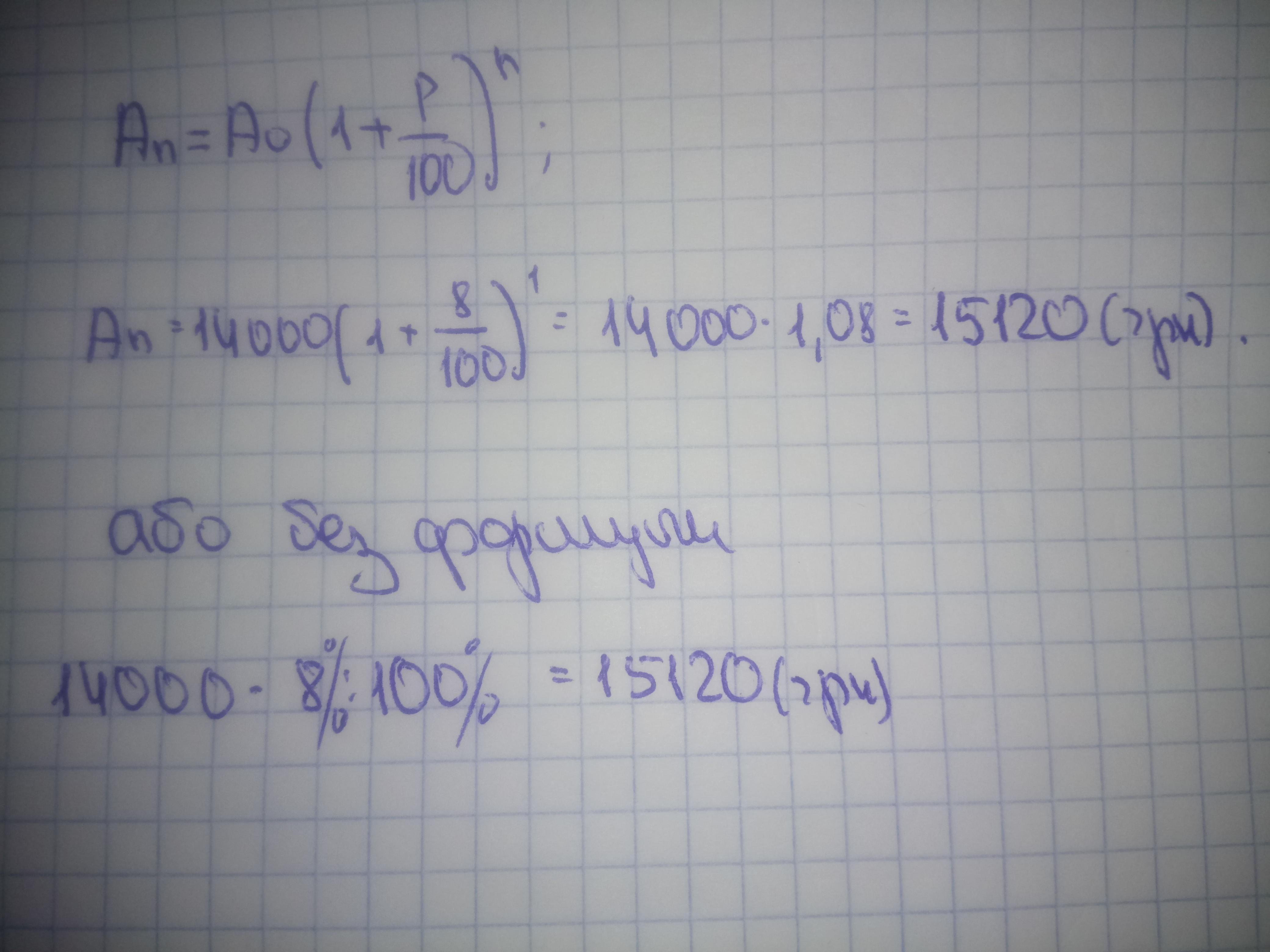 банк нараховує на строковий вклад 8% річних.вкоадник поклав на рахунок 14000 грн.скільки гривень буде на цьому рахунку через рік,якщо ніяких операцій,крім нарахування відсотків,з рахунком не проводитиметься.