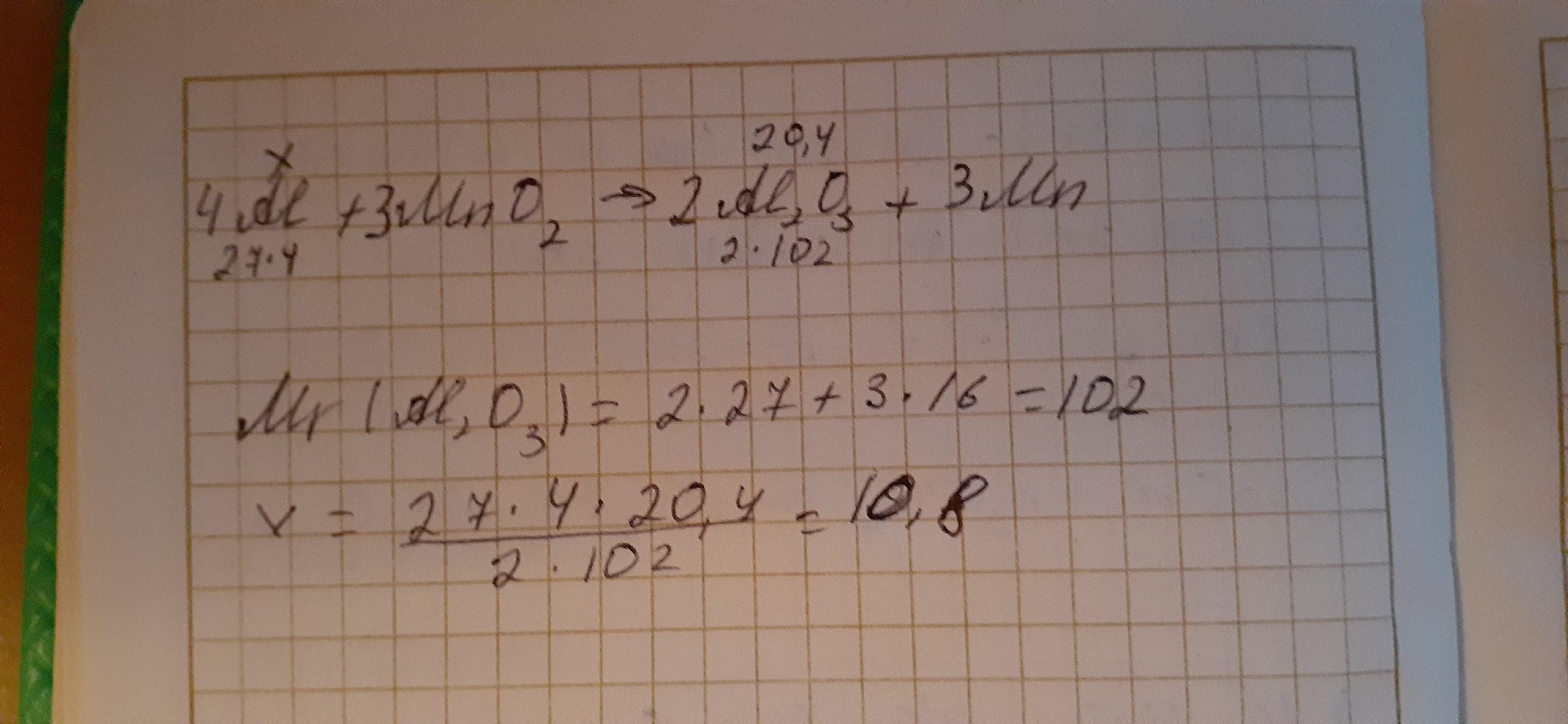 2)При взаимодействии алюминия с оксидом марганца(IV) образуются оксид алюминия и марганец. Для получения 20,4г оксида алюминия необходимо взять ___ г алюминия