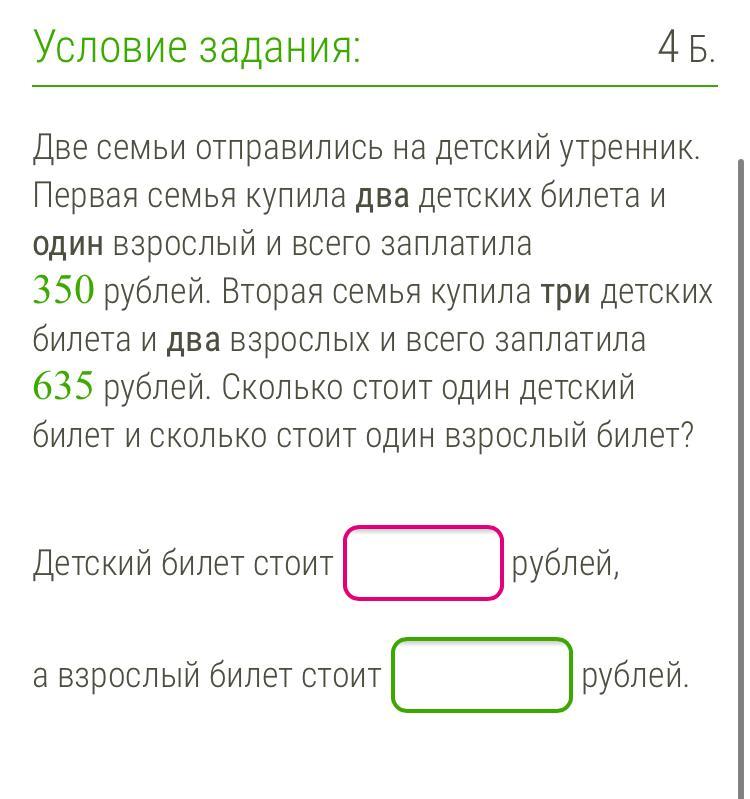 во 2 номере составляем уравнения. Возьмём детские за x, а взрослые за y. Для первой семьи 2x+y=350 для второй 3x+2y=635. Так же как в 1 номере переносим и приравниваем 350-2x=(635-3x)/2 700-4x=635-3x x=65 подставляем в 1 выражение 2*65+y=350, y=220