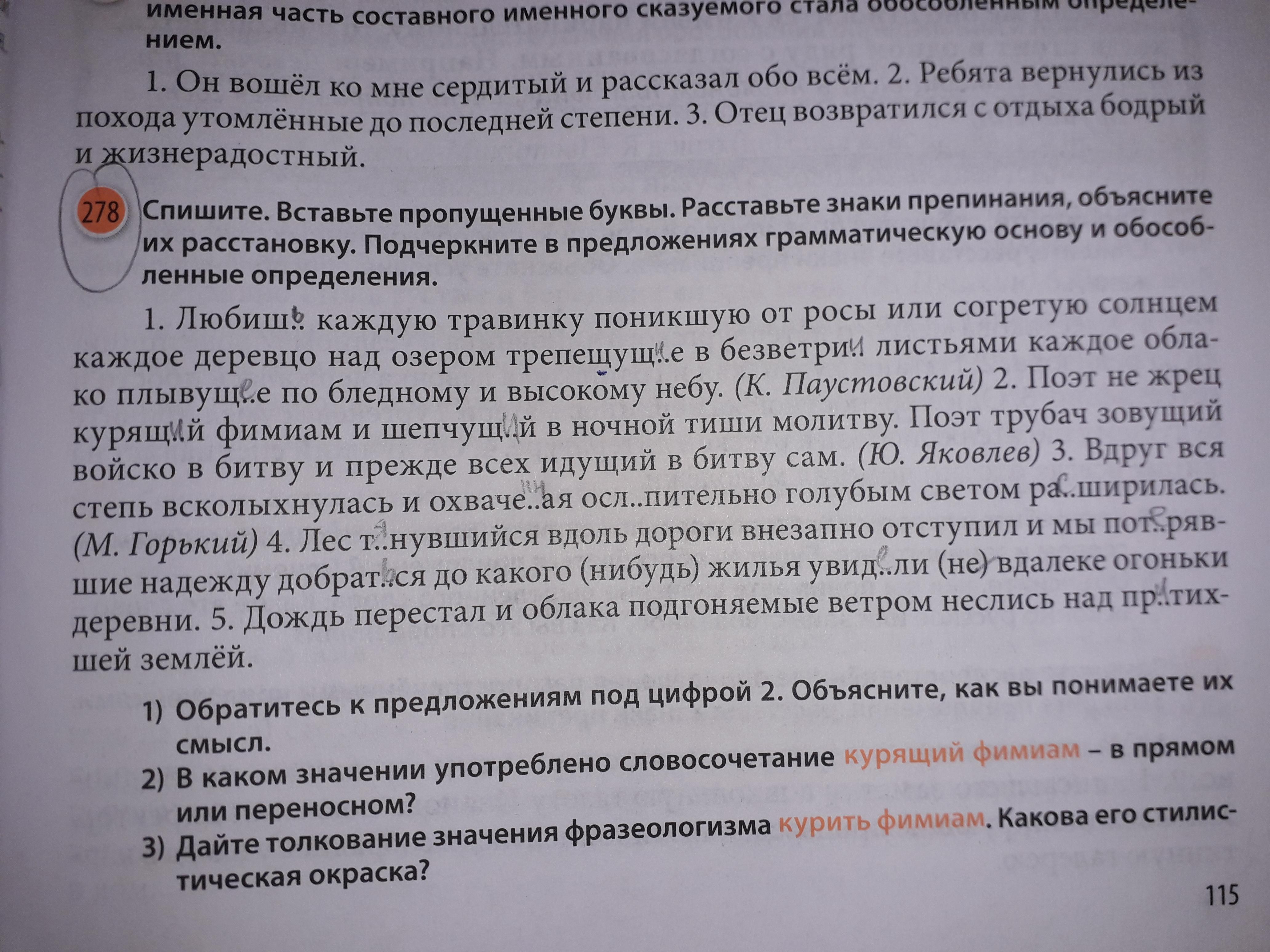 Ответ: Любишь каждую травинку, поникшую от росы и согретую солнцем, каждое деревцо над озером, трепещущее в безветрии листьями, каждое облако, плывущее по бледному и высокому небу. Поэт — не жрец, курящий фимиам и шепчущий в ночной тиши молитву. Поэт — трубач, зовущий войско в битву и прежде всех идущий в битву сам. Вдруг вся степь всколыхнулась и, охваченная ослепительно голубым светом, расширилась. Лес, тянувшийся вдоль дороги, внезапно отступил и мы, потерявшие надежду добраться до какого-нибудь жилья, увидели невдалеке огоньки деревни. Дождь перестал и облака, подгоняемые ветром, неслись над притихшей землей.