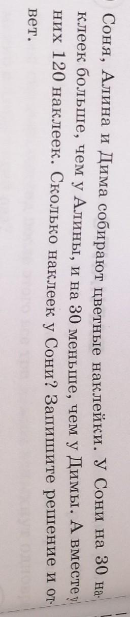 Пусть x наклеек у Сони, тогда у Алины x-30, а у Димы x+30. В сумме у всех троих 120 наклеек. Получаем следующее уравнение: