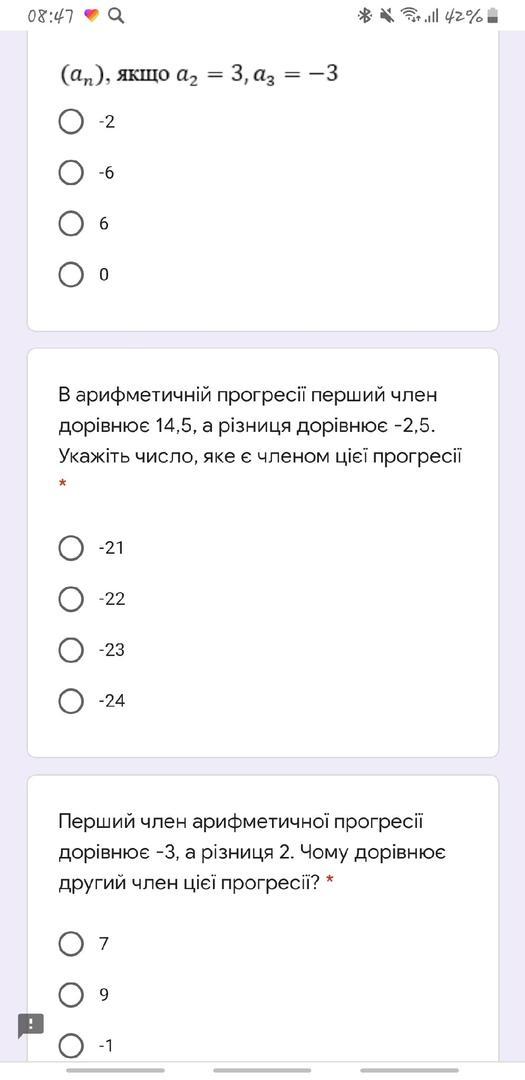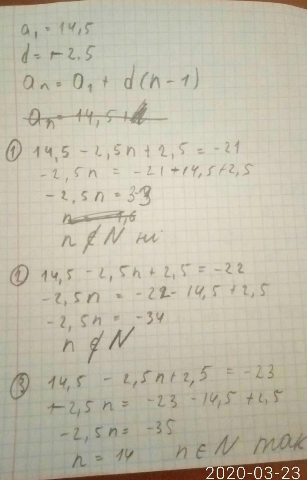 В ріфметичнфй прогресіі перший член дорівнює 14,5, а різниця дорівнює -2,5. Укажіть число, яке є членом цієї прогресії -21,-22,-23,-24