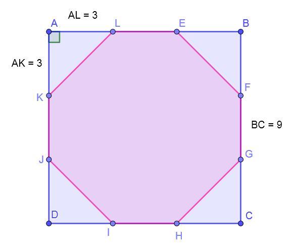 Внутри квадрата таким образом образовался 8-угольник и 4 равных равнобедренных прямоугольных треугольника с катетами 3.