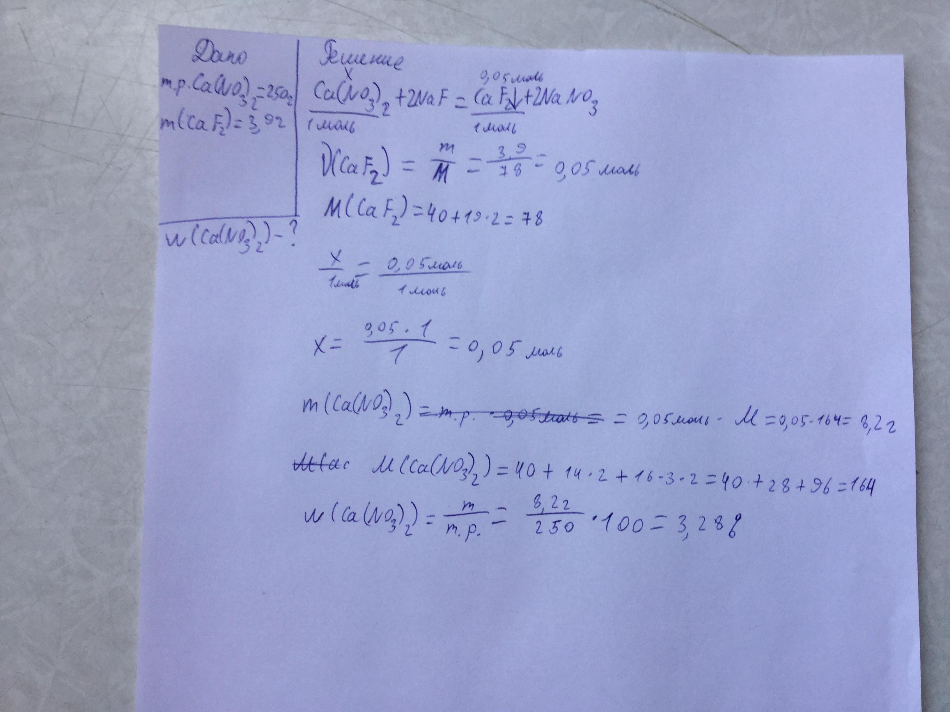 К 250 г раствора нитрата кальция добавляли раствор фторида натрия до прекращения выпадения осадка. Масса осадка составила 3,9 г.