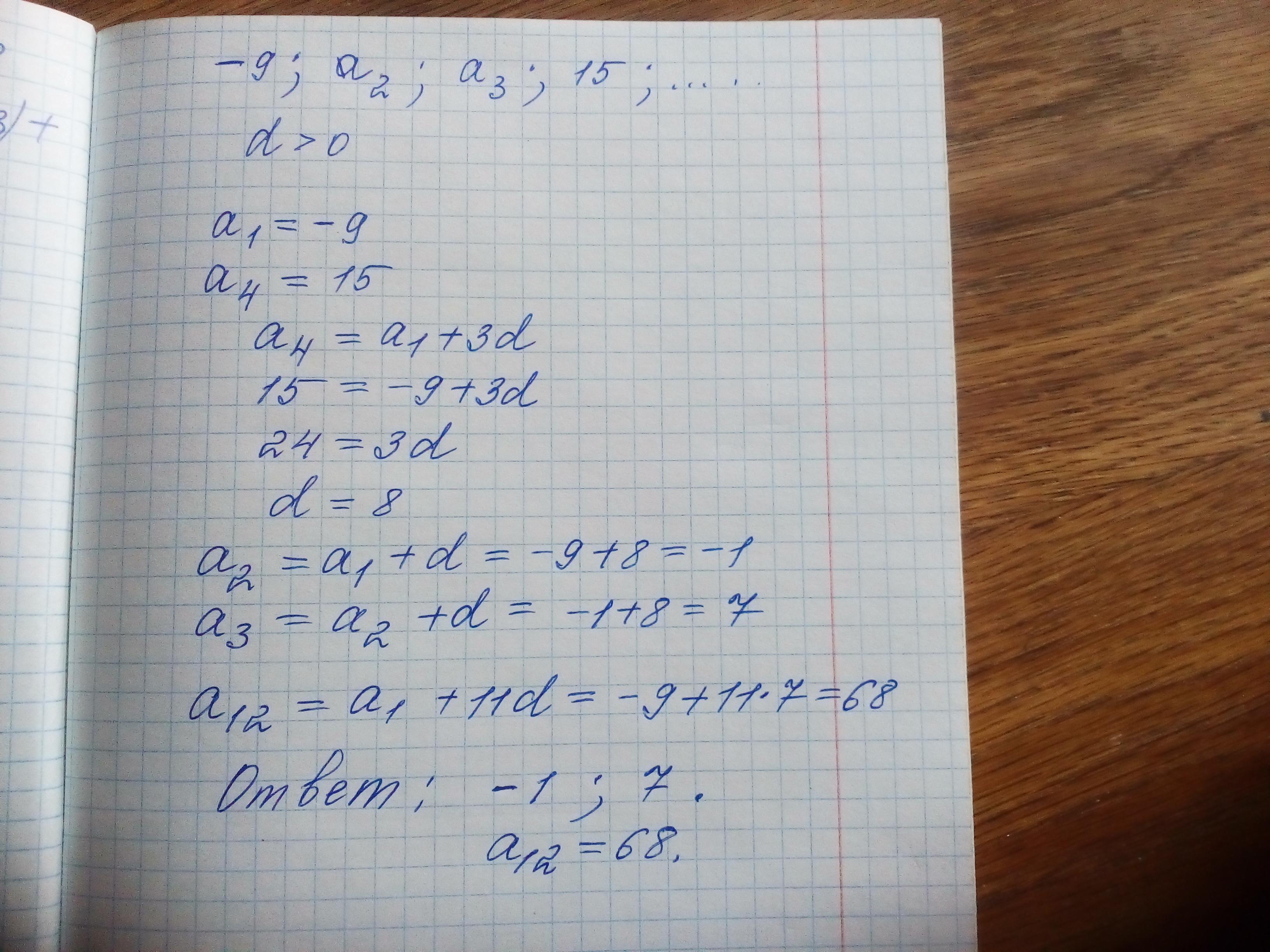 -9 і 15 вставте такі два числа ,щоб усі чотири числа утворили зростаючу арифметичну прогресію.Знайдіть 12 й член цієї прогресії