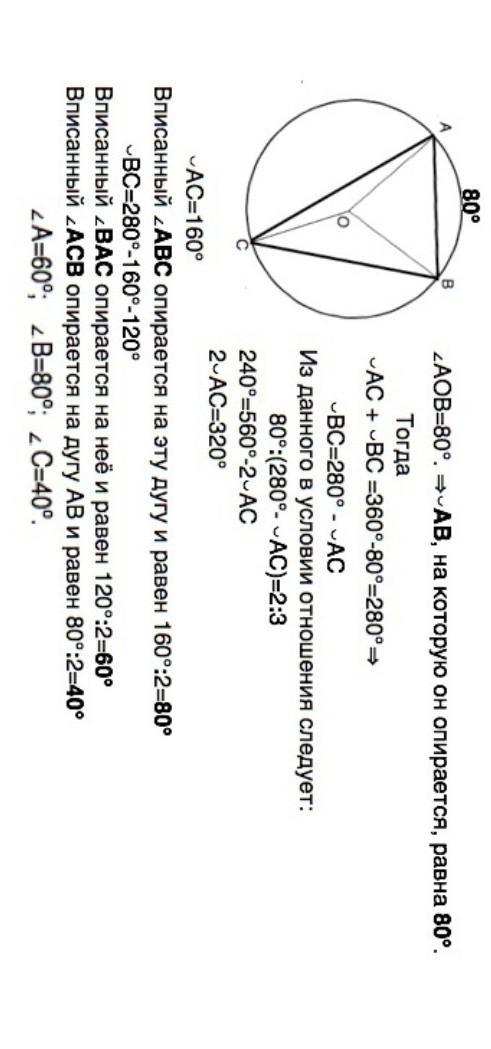 Вершины треугольника АВС лежат на окружности с центром О. Угол АОВ - 80 градусов, Дуга АС относится к дуге ВС как 2 к 3. Найти углы треугольника АВС