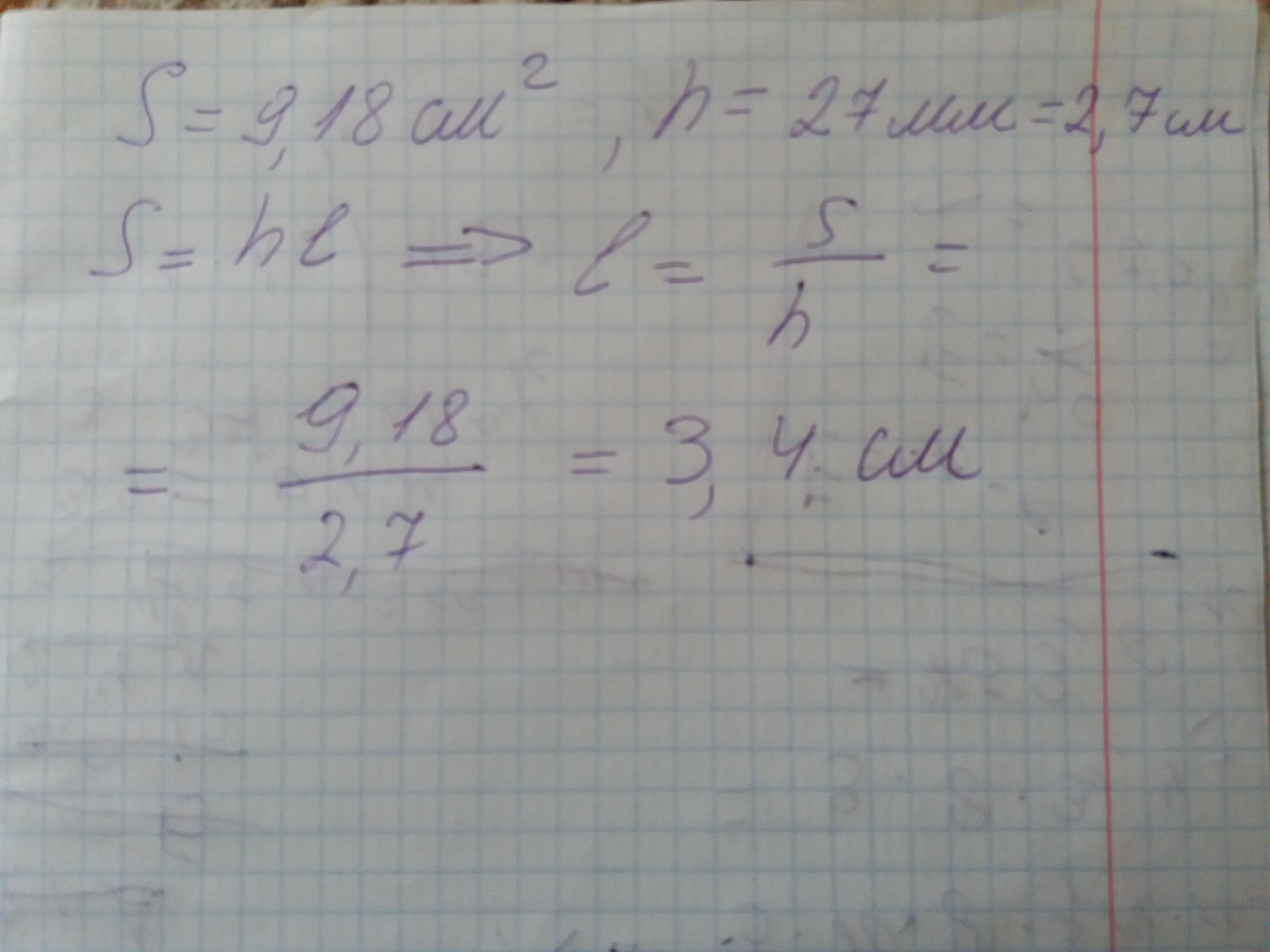 S=h*l,l=S/h=9,18÷2,7=3,4 cm
