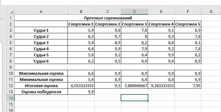 Спортсмен 5: =СРЗНАЧ(F3:F8)