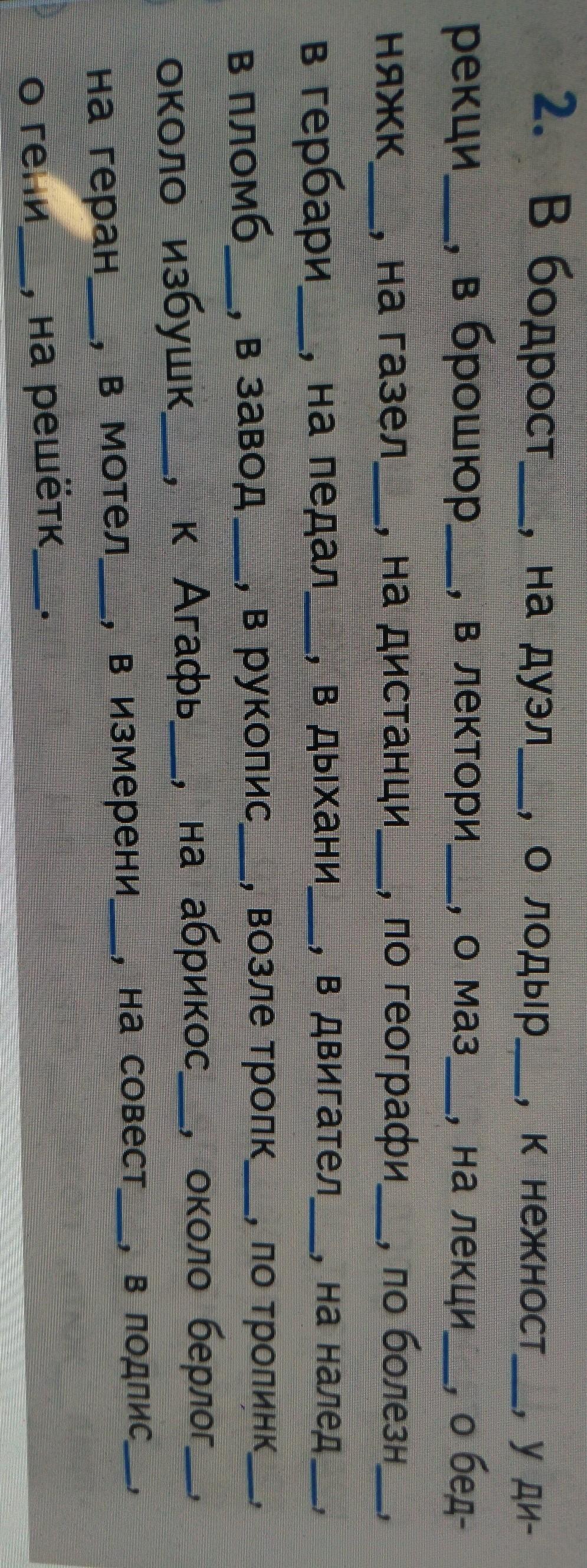 В бодростИ ( 3 скл. П.п.), на дуэлИ (3скл. П.п.), о лодырЕ (2скл. П.п.), к нежностИ (3скл., Д.п.), у дирекциИ (сущ. на -ия, Р,п.), в брошюрЕ (1скл., П.п.), в лектории (с. на -ий, П.п.), о мази (3 скл., П.п.), на лекции (с. на -ия, П.п.), о бедяжкЕ(1 скл. П.п.), на газелИ(3скл. П.п.), на дистанциИ (на -ия, П.п.), по географиИ ( на -ия, Д.п.), по болезнИ(3скл. Д.п.), в гербариИ(с. на -ий, .п.п), на педалИ(3скл. П.п.), в дыханиИ(с. на -ие, П.п.), в двигателЕ (2скл., П.п.), на наледИ (3скл., П.п.), в пломбЕ(1скл. П.п.), в зАводИ (ударение на А, заводь - 3скл. П.п.), в рукописИ(3скл. П.п.), возле тропинкИ(1скл. Р.п.), по тропинкЕ(1скл. Д.п.), около избушкИ(1скл. Р.п.), к АгафьЕ(1скл. Д.п.), на абрикосЕ (2скл. П.п.), около берлогИ(1 скл. Р.п.), на геранИ(3скл. П.п.), в мотелЕ(2 скл., П.п.), в измерениИ(с. на -ие, П.п.), на совестИ(3скл. П.п.), в подписИ(3скл. П.п.), о гениИ (с. на -ий, П.п.), на решёткЕ (1 скл.П.п.)