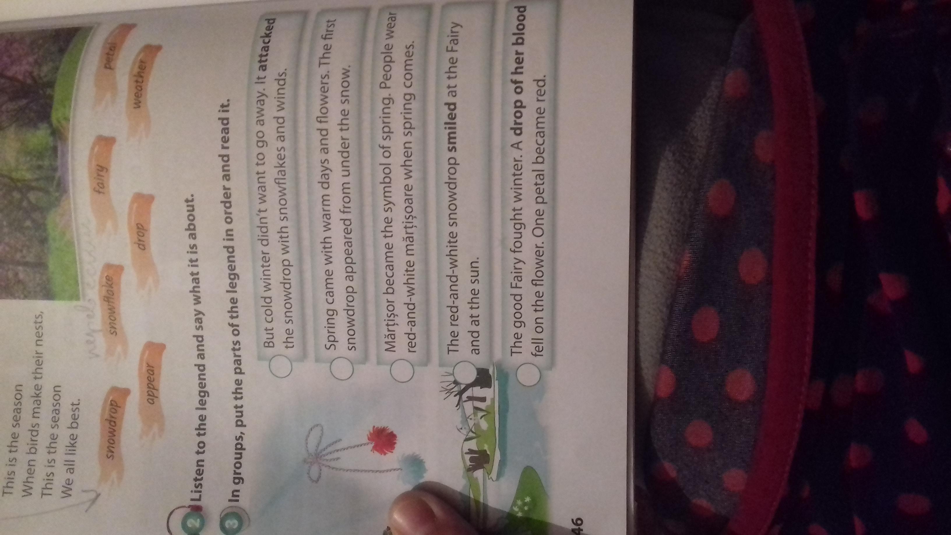 Ответ:Spring came with warm days and flowers. The first snowdrop appeared from under the snow.But cold winter didnt want to go away. It attacked the snowdrop with snowflakes and winds. The good fairy fought winter. A drop of her blood fell on the flower. Ome petal become red. The red-and-white snowdrop smiled at the Fairy and at the sun. Martisor became the symbol of spring. People wear red-and-white martisoare when spring comes.