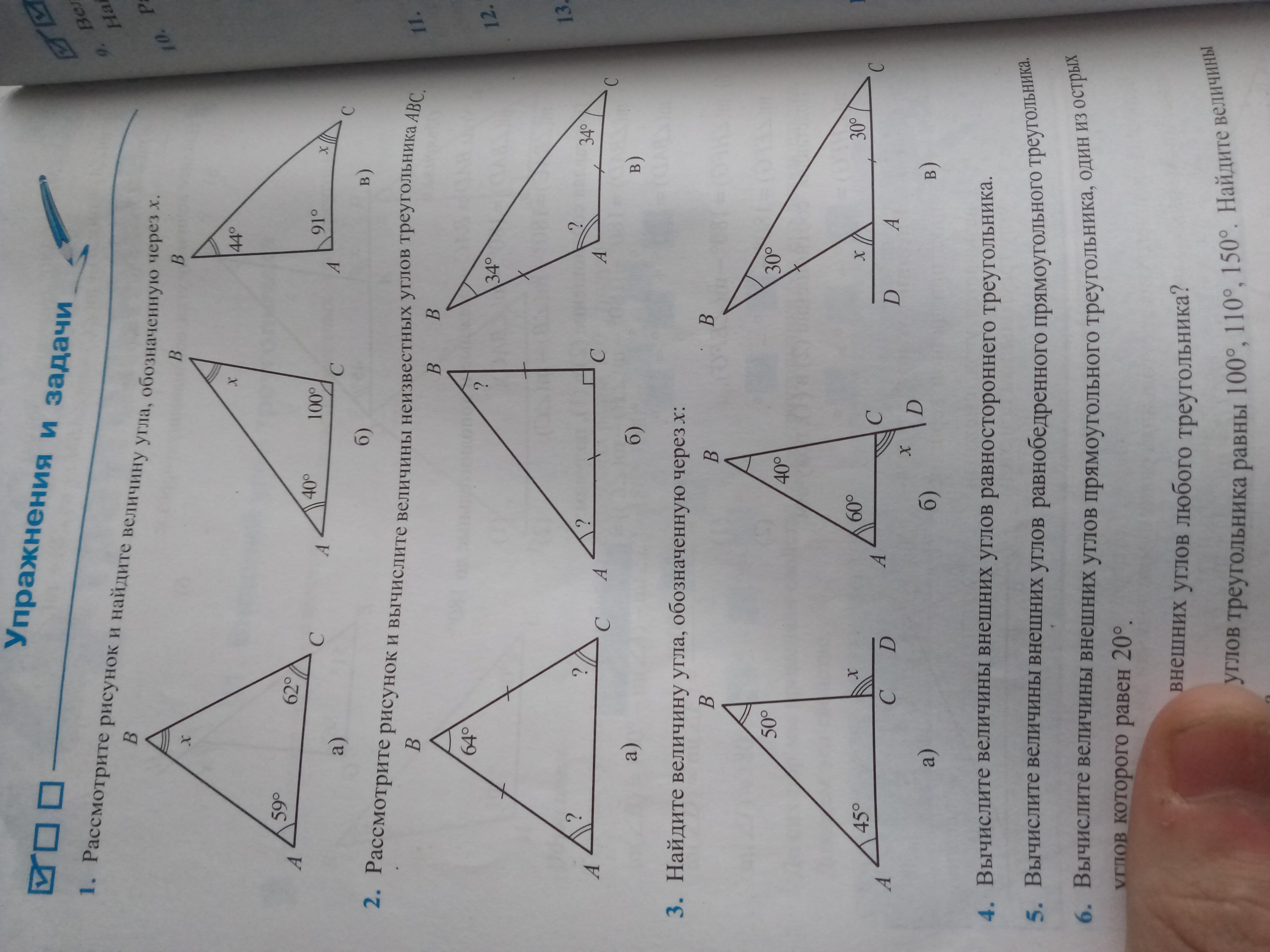 3. а) Угол x - внешний угол треугольника ABC. Мы знаем, что внешний угол равен сумме двух не смежных с ним. Исходя из этого, можем найти угол x: