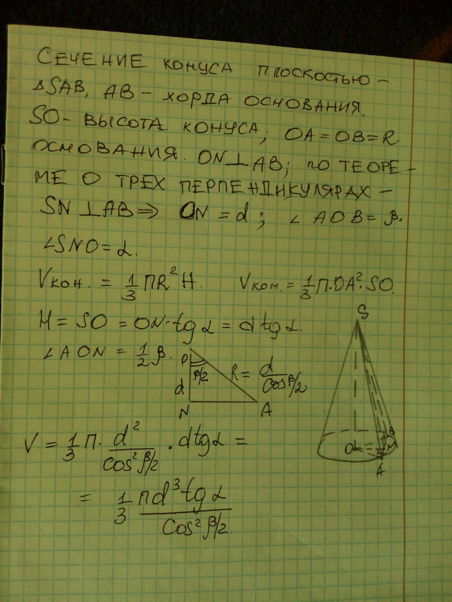 Через вершину конуса проведено площину під кутом альфа до площини основи. Ця площина перетинає основу конуса по хорді, яку видно з центра основи під кутом бета. Визначити об‘єм конуса, якщо центр його основи знаходиться на відстані d від хорди