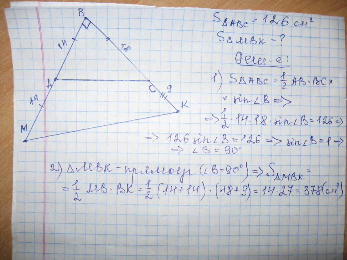 В треугольнике ABC стороны AB и BC равны соответственно 14 и 18 см. Сторона AB продолжена за точку A на отрезок AM, равный AB. Сторона BC продолжена за точку C на отрезок KC, равный половине BC. Найдите площадь треугольника MBK, если площадь треугольника ABC равна 126 см (квадратных).