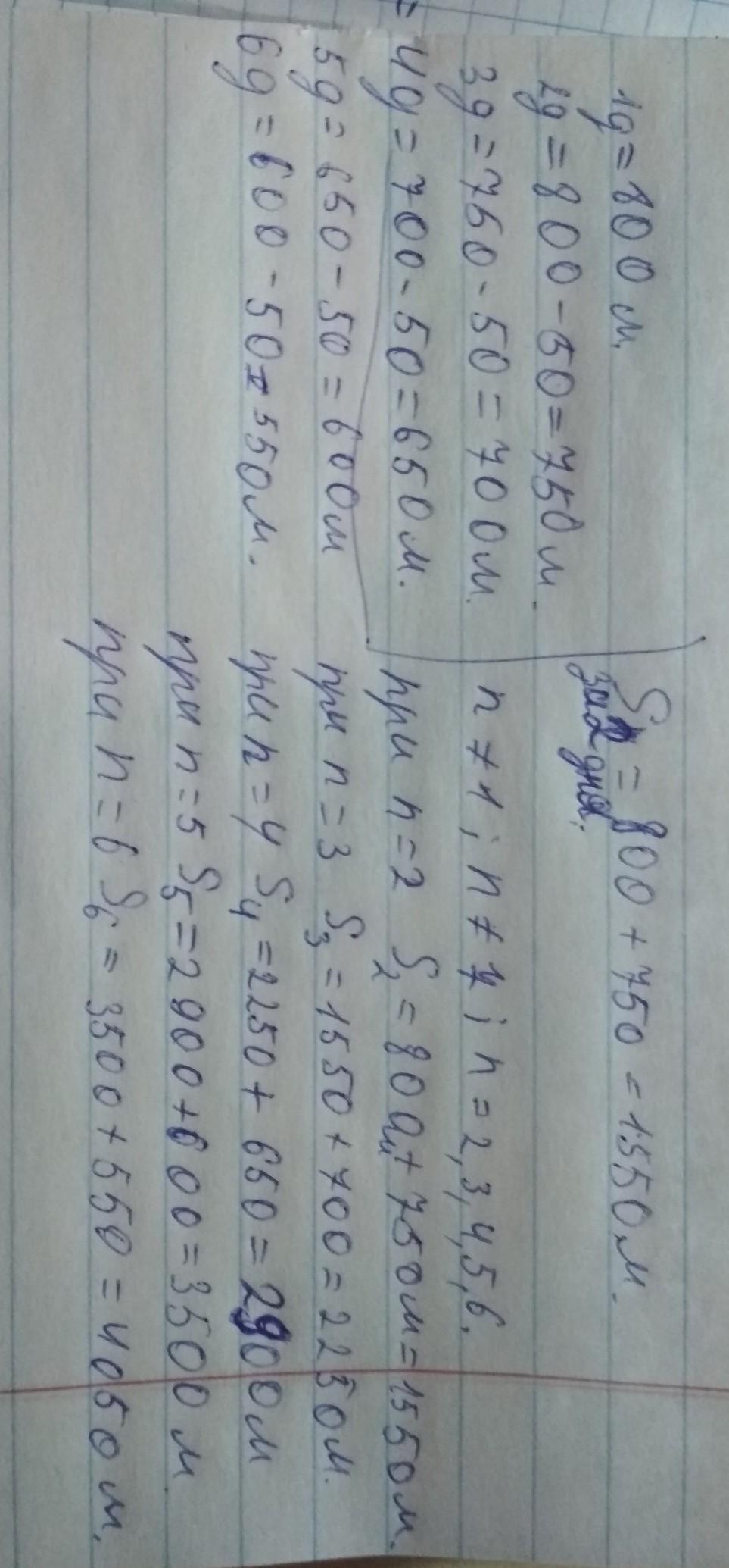 Альпинисты в первый день восхождения поднялись на 800м. Продолжая подъем, каждый следующий день они проходили на 50м. меньше, чем в предыдущий. На какую высоту поднялись альпинисты за два дня восхождения? Составите формулу, по которой можно вычислить высоту Sn ( в метрах), которую преодолели альпинисты за n дней восхождения, 1< n < 7. с решением.СРОЧНО