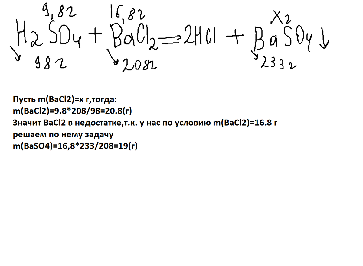 Определить массу BaSO4 которая образуется при взаимодействии H2SO4 массой 9,8г с BaCl2 массой 16,8 г.