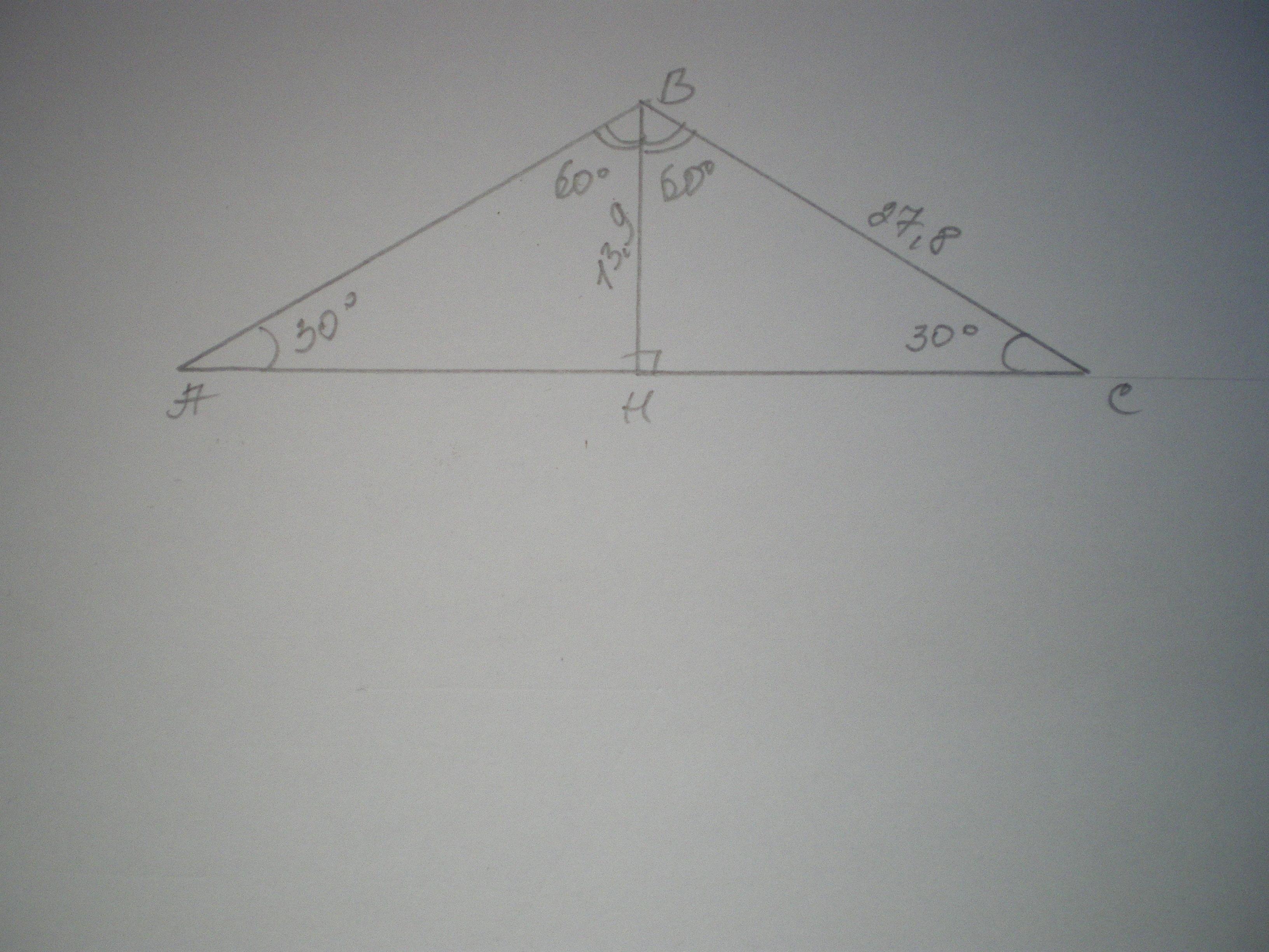 В равнобедренном треугольнике ABC проведена высота BD к основанию AC . Длина высоты — 13,9 см, длина боковой стороны — 27,8 см. Определи углы этого треугольника. ∡ BAC = ?° ∡ BCA = ?° ∡ ABC = ?