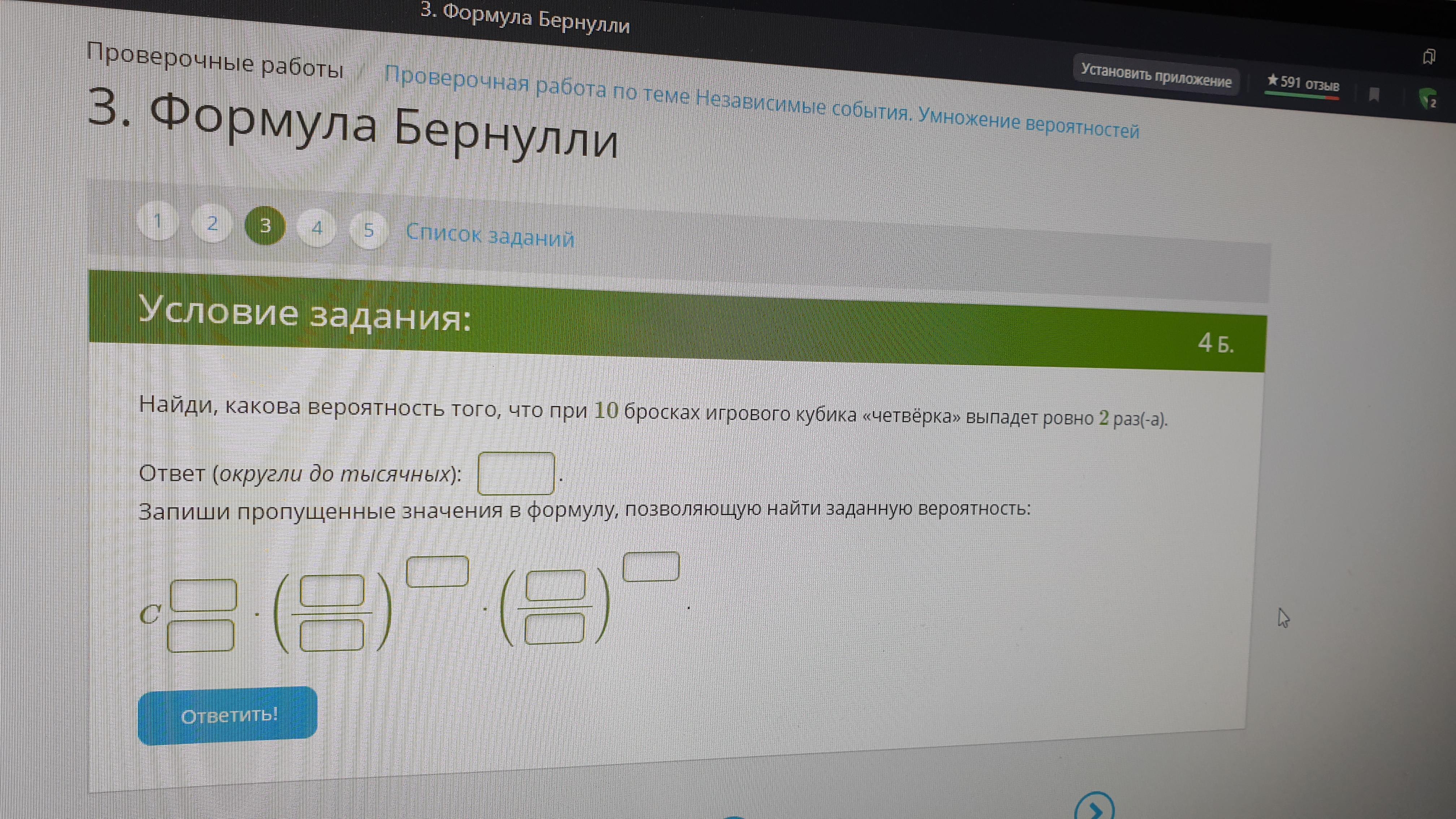 q=1-p=1-(1/6)=5/6 - вероятность с которой не выпадает "4-ка"