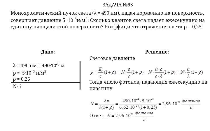 Пучок света с длиной волны 0,49 мкм, что падает перпендикулярно к поверхности, производит давление 5 мкПа. Сколько фотонов ежесекундно попадает на 1 м2 этой поверхности? Коэффициент отбивания света от данной поверхности - 0,25.
