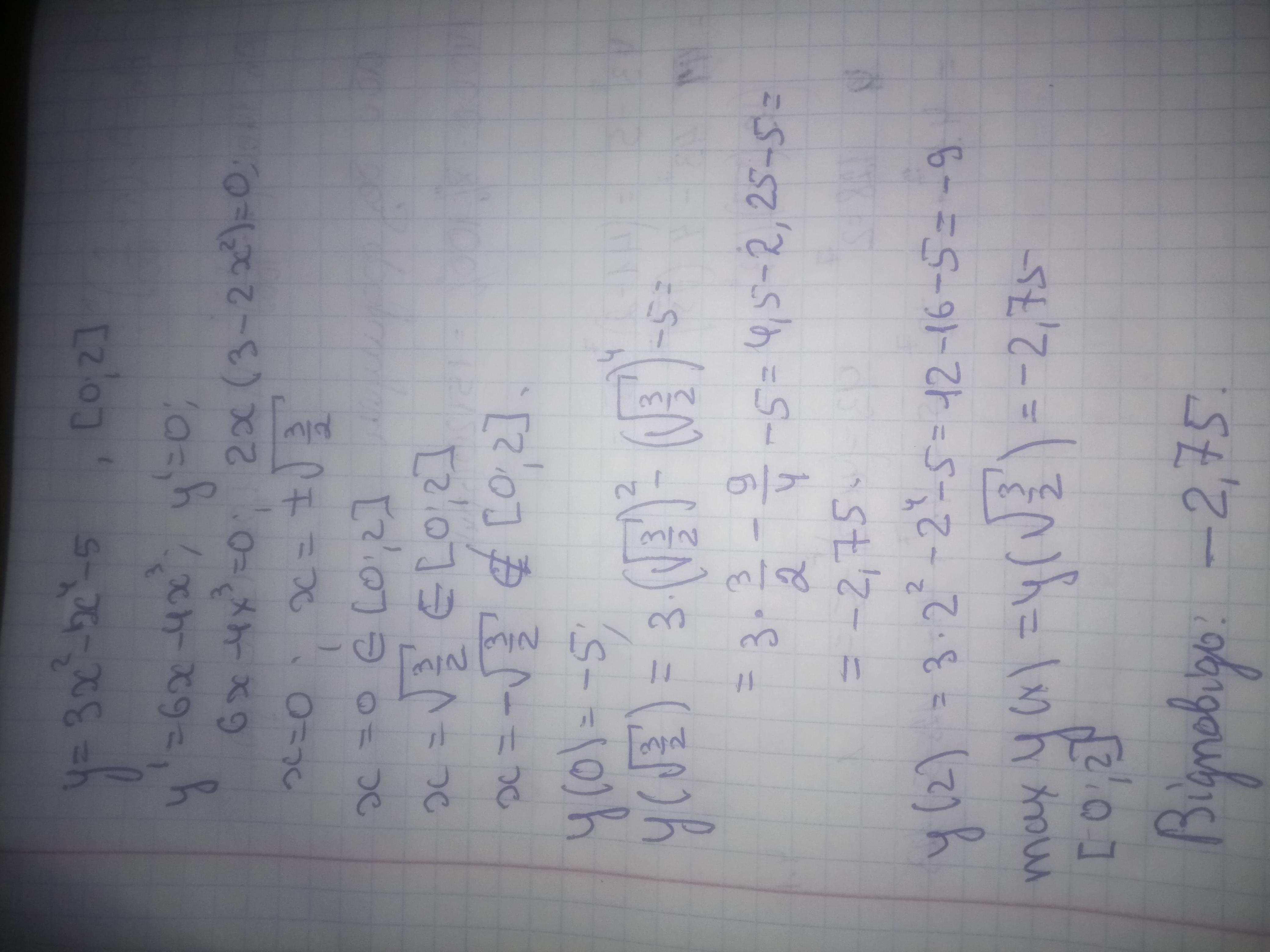 Знайдіть НАЙБІЛЬШЕ значення функції у=3х^2-х^4-5 на проміжку [0;2].