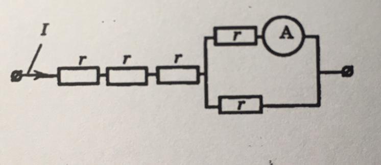 Через участок цепи (см. рис.) течет постоянный ток I = 10 А. Какую силу тока показывает амперметр? Сопротивлением амперметра пренебречь.