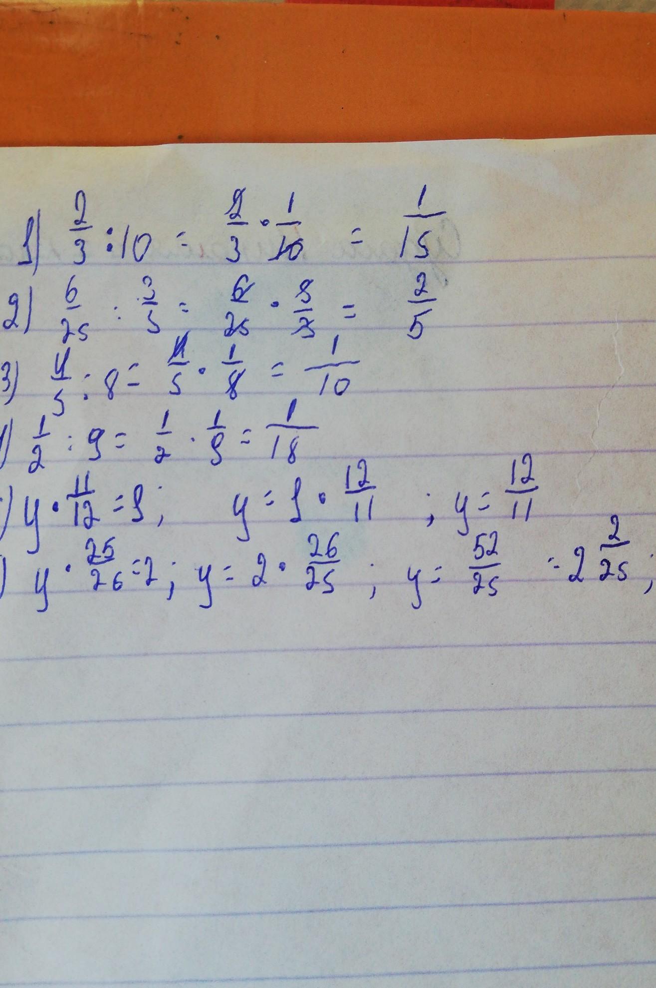 1. 2/3 : 10 = 2/3 * 1/10 = 2/30 = 1/15