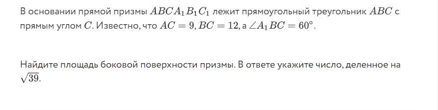 S(бок)=Р(осн)*АА1=(9+12+15)*3V39=36*3V39=108V39, отв 108V39/V39=108
