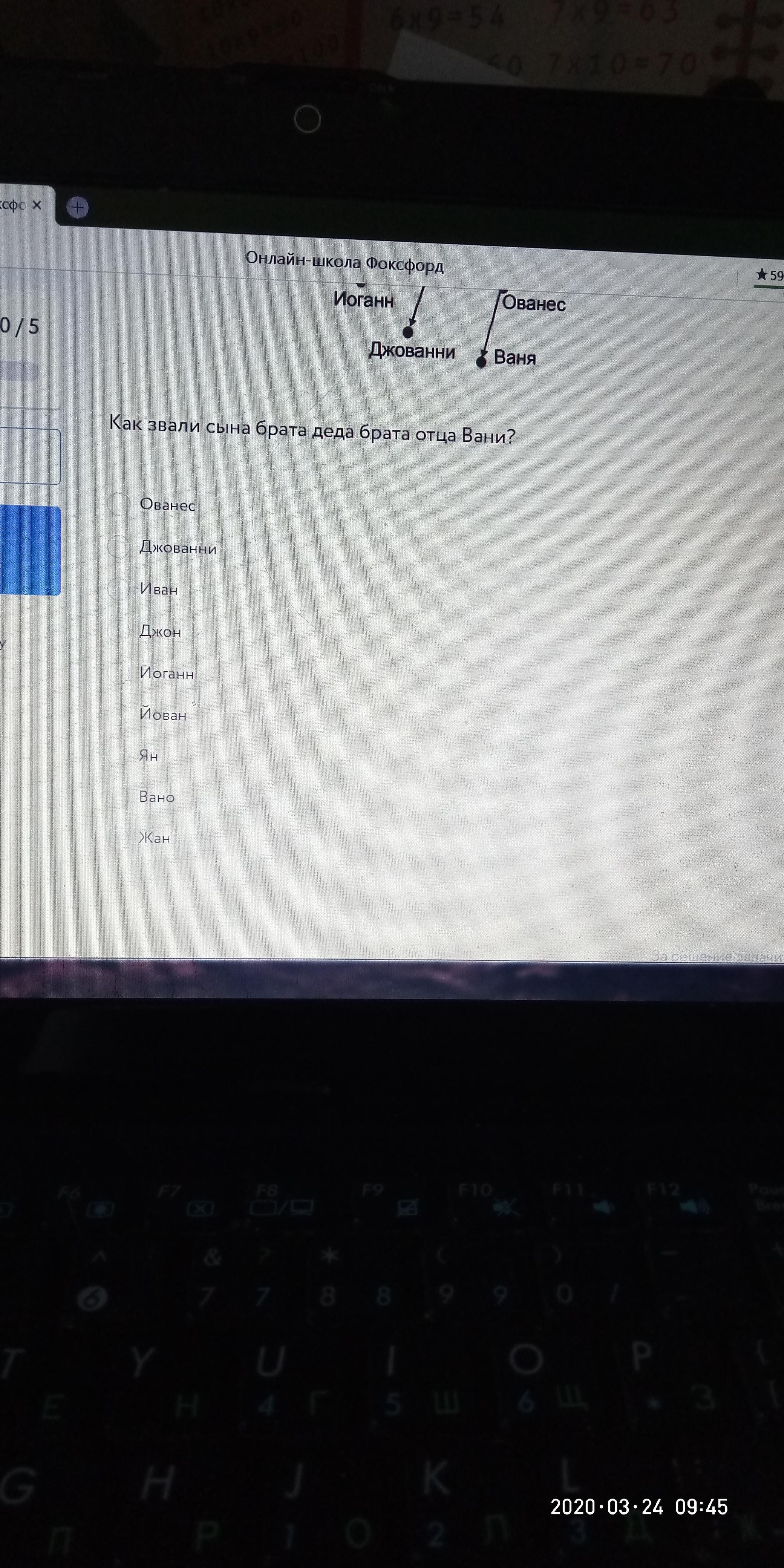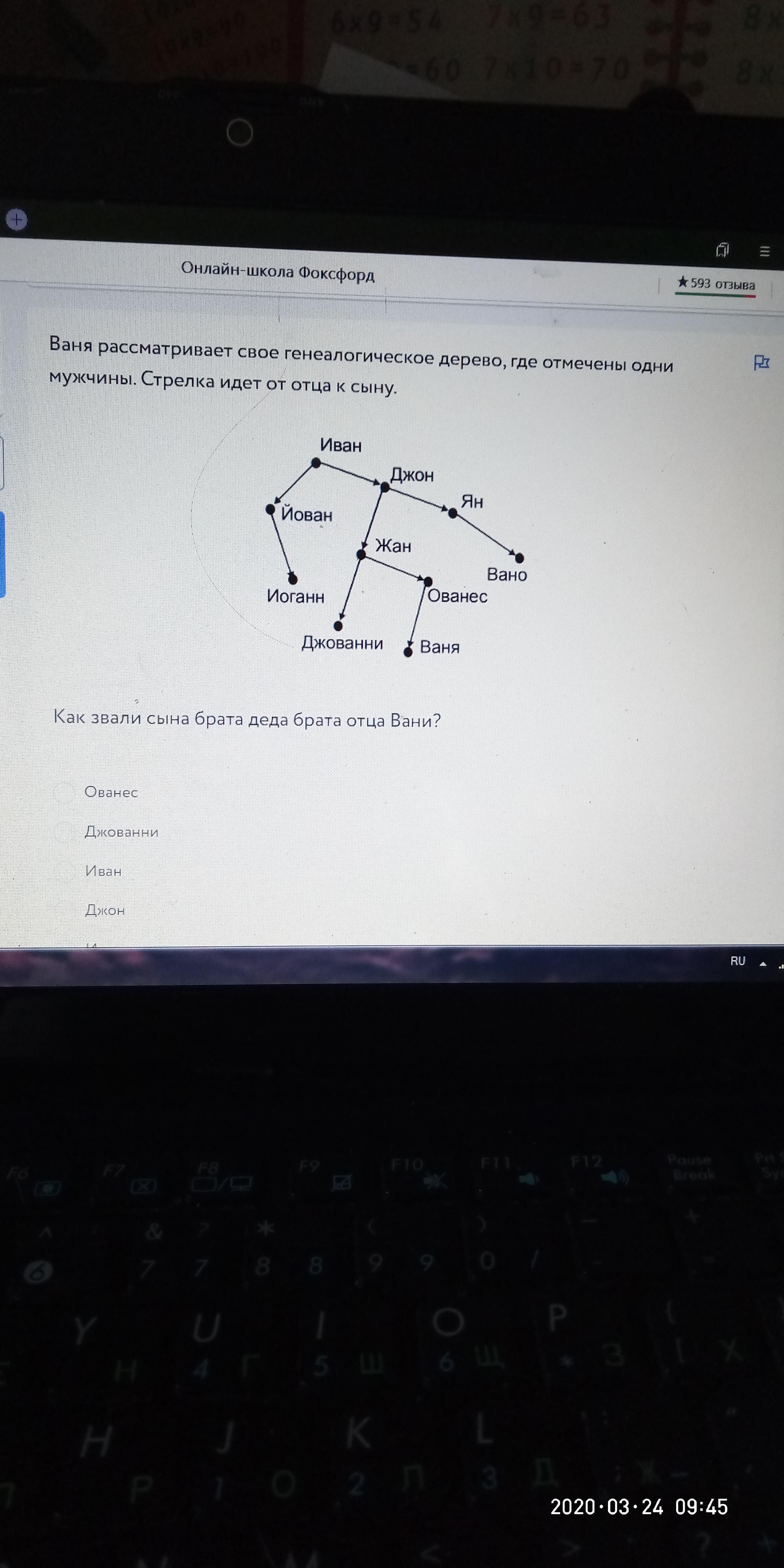 Пошаговое объяснение: отца Вани зовут Ованес, отца Ованеса (дедушка Вани) зовут Жан, брата дедушки зовут Ян, отца Жана и Яна зовут Джон, сына Яна зовут Вано (Вано является двоюродным братом Ованеса)