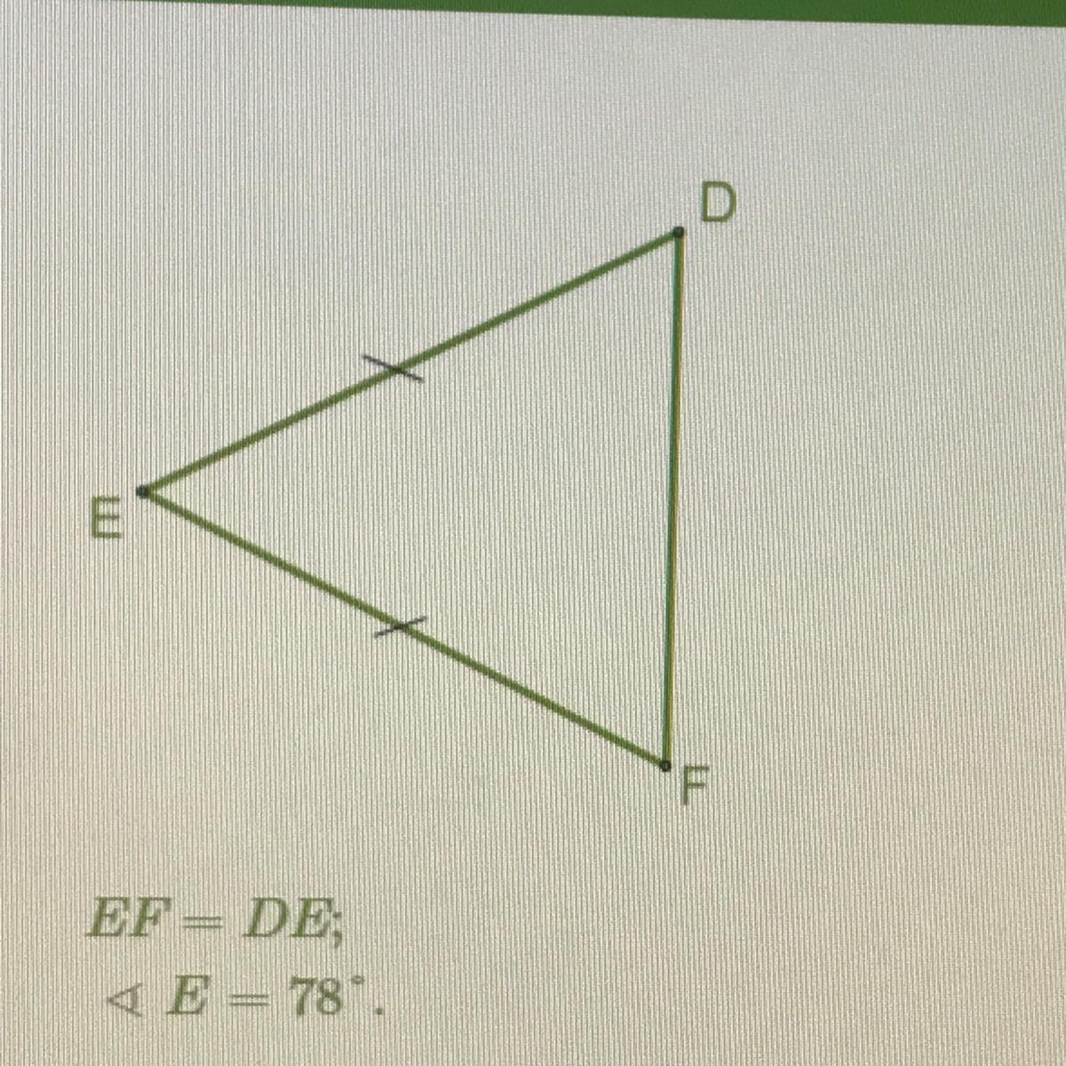 Углы при основании равнобедренного треугольника равны, поэтому ∠D=∠F=(180°-78°)/2=51°
