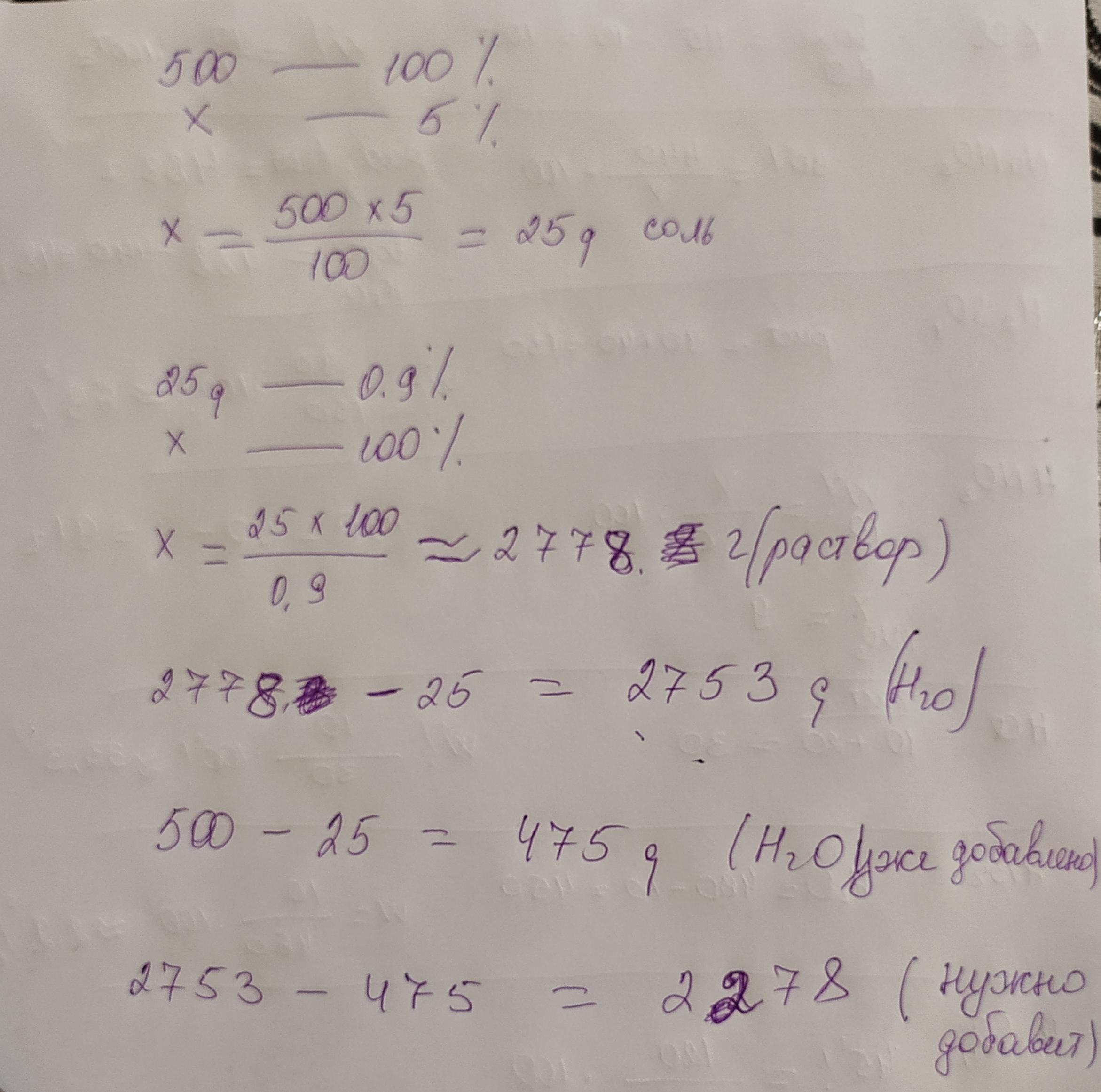Какую массу воды необходимо добавить к 500гр 5%-ного раствора поваренной соли,чтобы превратить его в физиологический раствор(физиологический раствор это 0,9%-ный раствор поваренной соли).