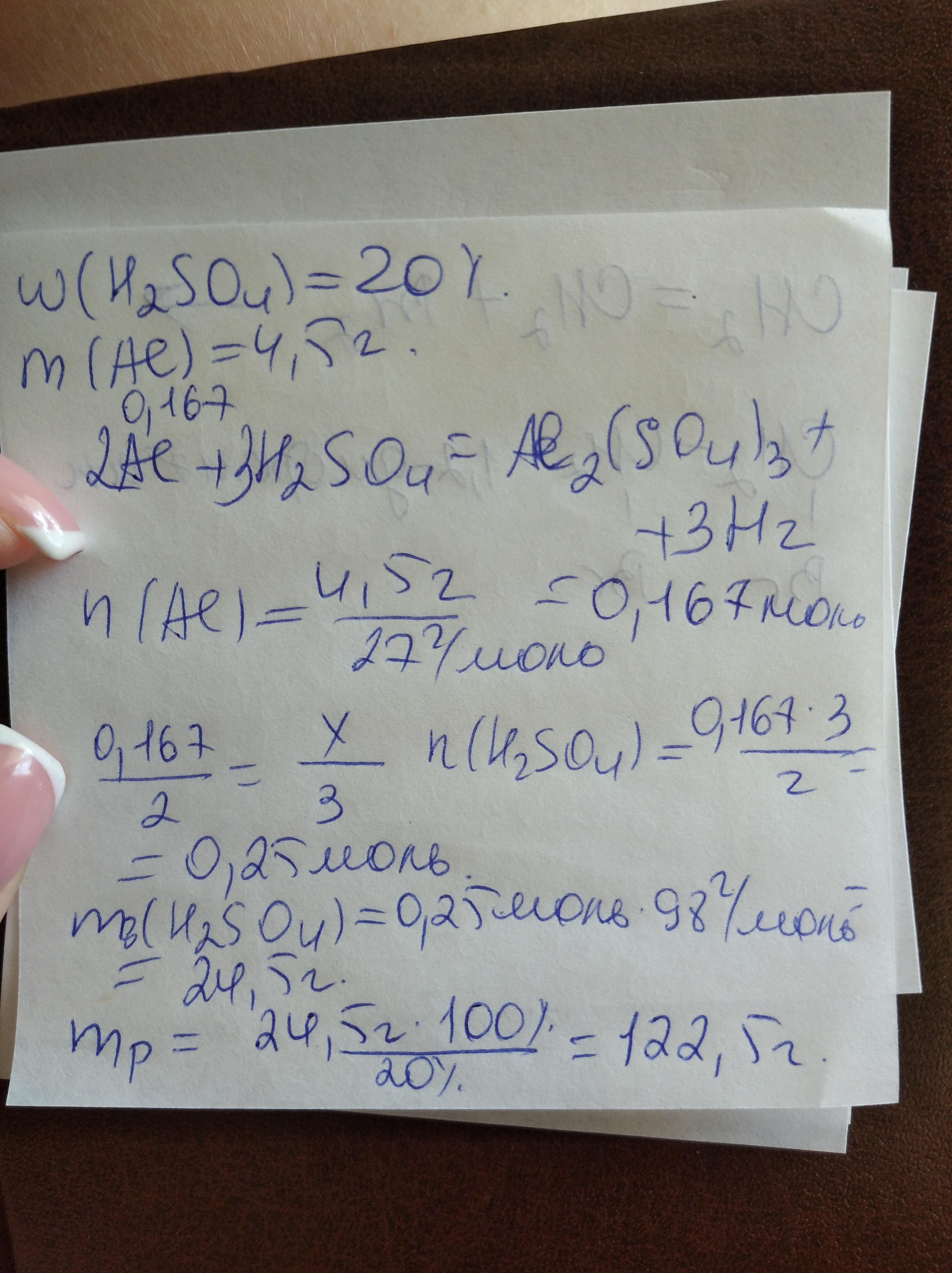 Вычислите массу 20% -ного раствора серной кислоты, полностью вступающей в реакцию с 4,5 г алюминия