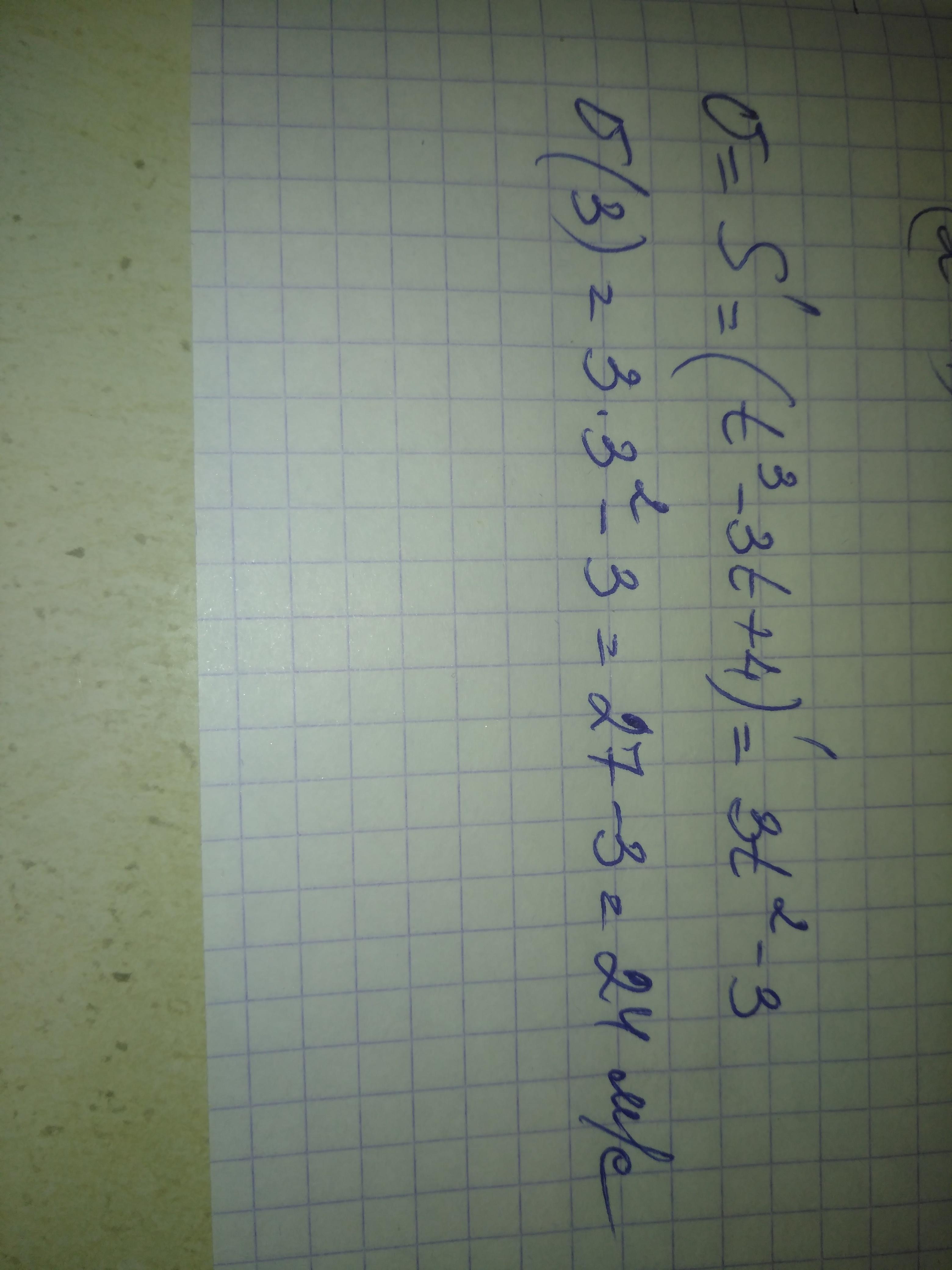 Тело движется по прямой так, что расстояние S до него от некоторой точки A этой прямой изменяется по закону S=t^3 -3t+4(м), где t - время движение в секундах.Найдите скорость тела через 3 с после начала движения.